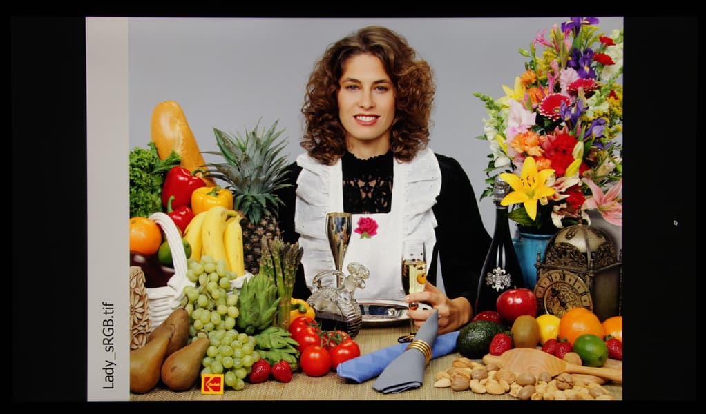 Экран имеет хорошие углы обзора без значительного сдвига цветов даже при больших отклонениях взгляда от перпендикуляра к экрану и без инвертирования оттенков. Просто для иллюстрации приведем фотографию, на которой на экран Apple iMac выведена тестовая картинка с интегрированным профилем sRGB: