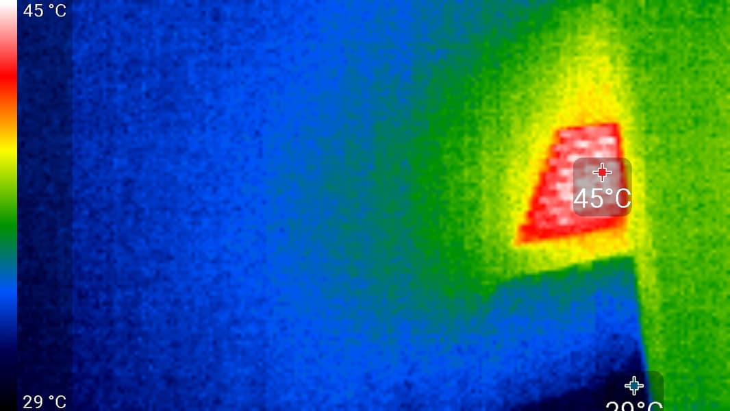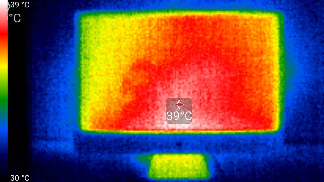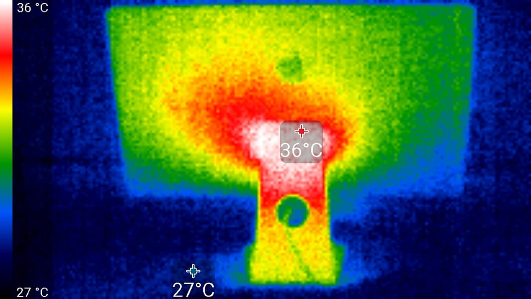 Видно, что нагрев больше в центральной части. Ножка скрывает источник тепла, но сбоку его видно: это вентиляционная решетка на задней панели: