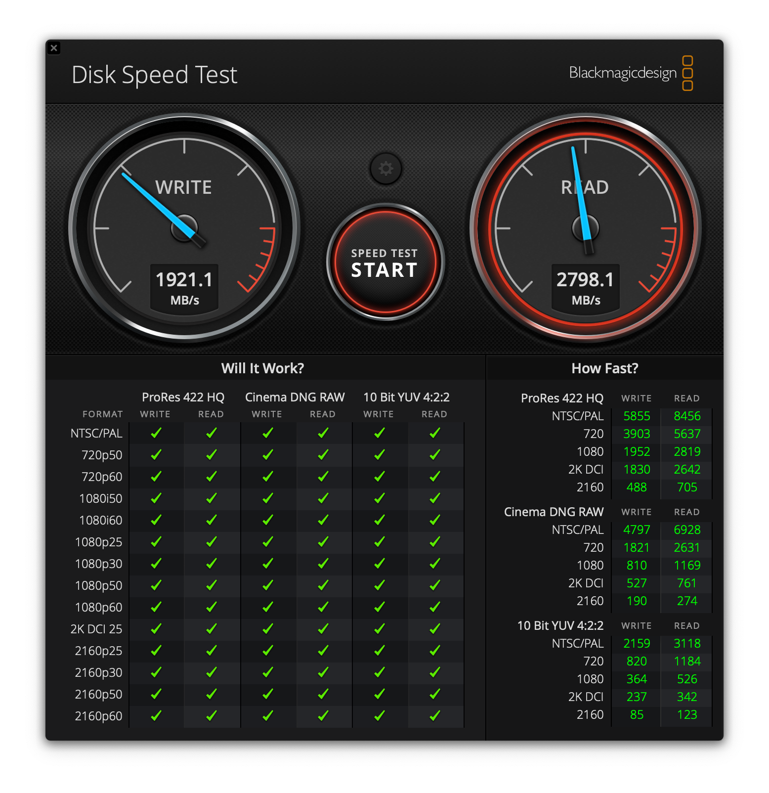 Если перечисленные выше бенчмарки помогают нам оценить производительность CPU и GPU, то BlackMagic Disk Speed ориентирован на тестирование накопителя: он измеряет скорости чтения и записи файлов.
