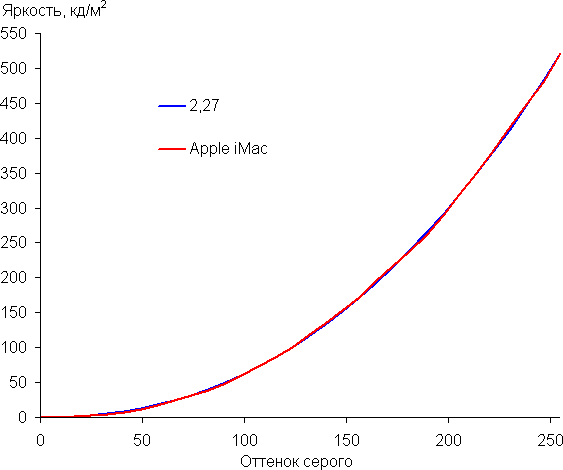 Контрастность (примерно в центре экрана) высокая — 1060:1. Время отклика при переходе черный-белый-черный равно 17 мс (10 мс вкл. + 7 мс выкл.), переход между полутонами серого 25% и 75% (по численному значению цвета) и обратно в сумме занимает 26 мс. Построенная по 32 точкам с равным интервалом по численному значению оттенка серого гамма-кривая не выявила завала ни в светах, ни в тенях. Показатель аппроксимирующей степенной функции равен 2,27, что незначительно выше стандартного значения 2,2. При этом реальная гамма-кривая почти не отклоняется от степенной зависимости: