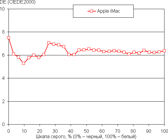 Баланс оттенков на шкале серого очень хороший, так как цветовая температура близка к стандартным 6500 К, а отклонение от спектра абсолютно черного тела (ΔE) меньше 10, что для потребительского устройства считается приемлемым показателем. При этом цветовая температура и ΔE мало изменяются от оттенка к оттенку — это положительно сказывается на визуальной оценке цветового баланса. (Самые темные области шкалы серого можно не учитывать, так как там баланс цветов не имеет большого значения, да и погрешность измерений цветовых характеристик на низкой яркости большая.)