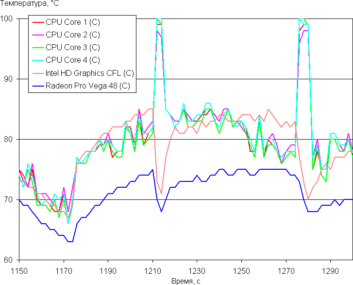 Используемый для нагрузки тест GFX Benchmark Metal нагружает CPU и GPU неравномерно во времени, максимальная долговременная нагрузка явно может быть выше, но все равно в пике температура ядер процессора на короткое время достигала 100 °C:
