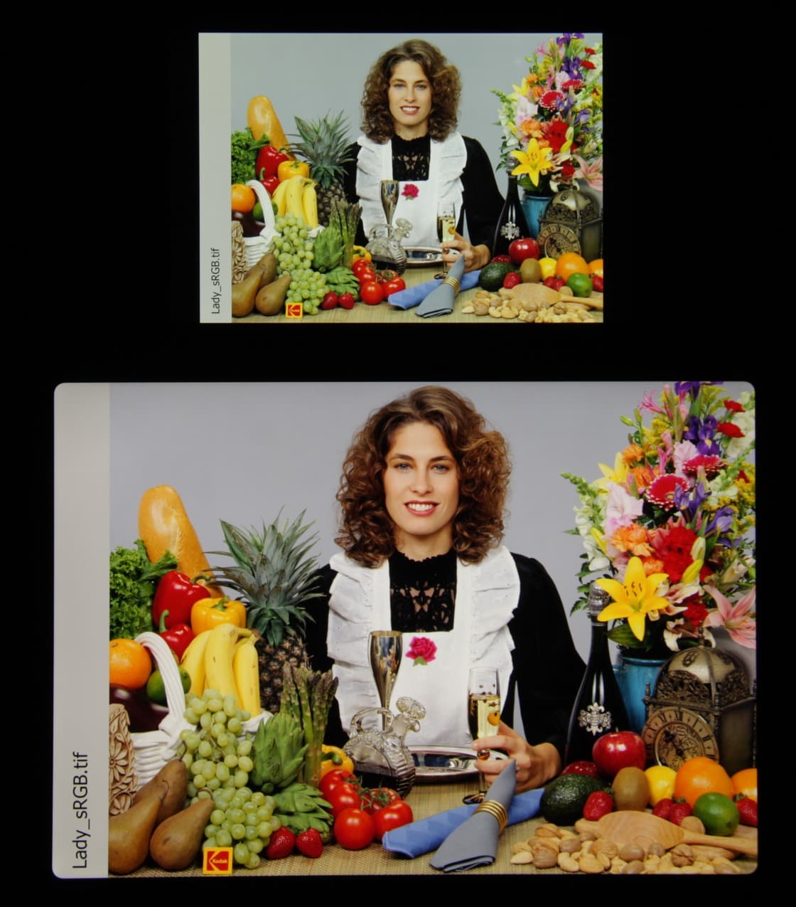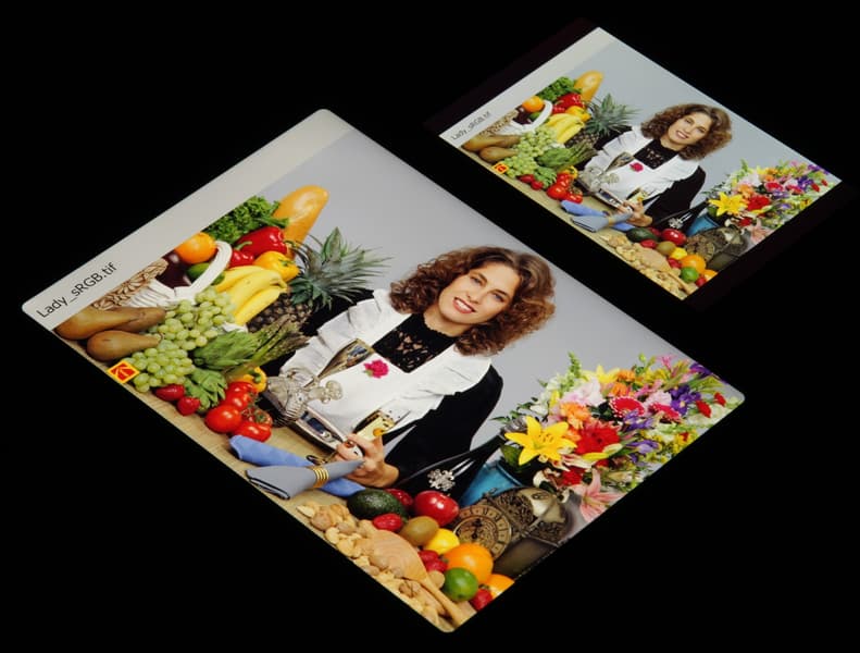 Это относится к тем изображениям, в которых прописан профиль sRGB или не прописано вообще никакого профиля. Родным же для топовых современных устройств Apple является цветовое пространство Display P3 с более насыщенными зеленым и красным цветами. Пространство Display P3 основано на SMPTE DCI-P3, но имеет точку белого D65 и гамма-кривую с показателем примерно 2,2. Кроме того, производитель заявляет, что начиная с iOS 9.3 на системном уровне поддерживается управление цветом, это облегчает приложениям под iOS задачу правильно выводить на экран изображения с прописанным цветовым профилем. Действительно, дополнив тестовые изображения (файлы JPG и PNG) профилем Display P3, мы получили цветовой охват шире sRGB (вывод в Safari):