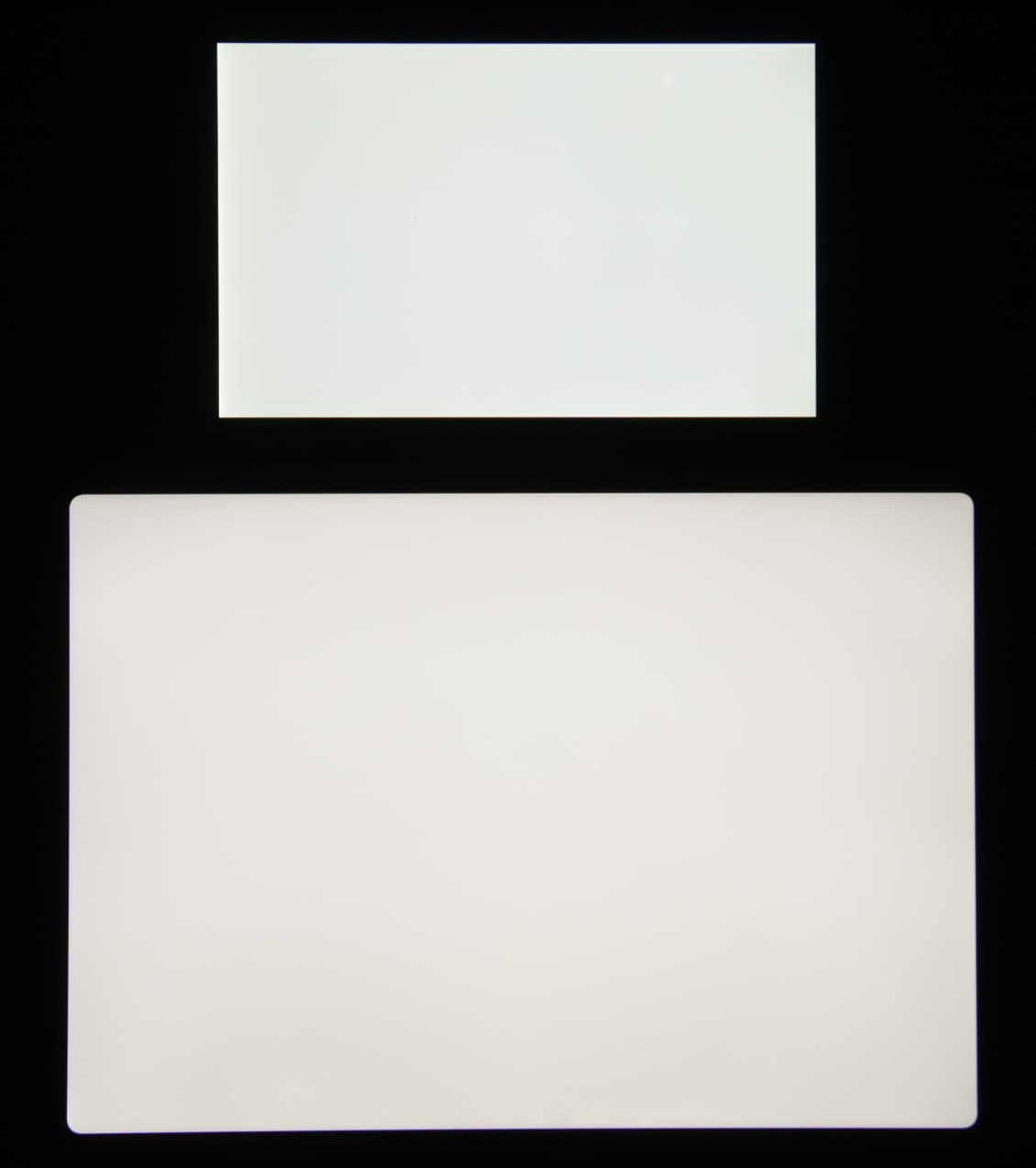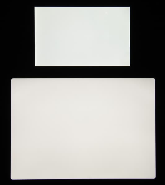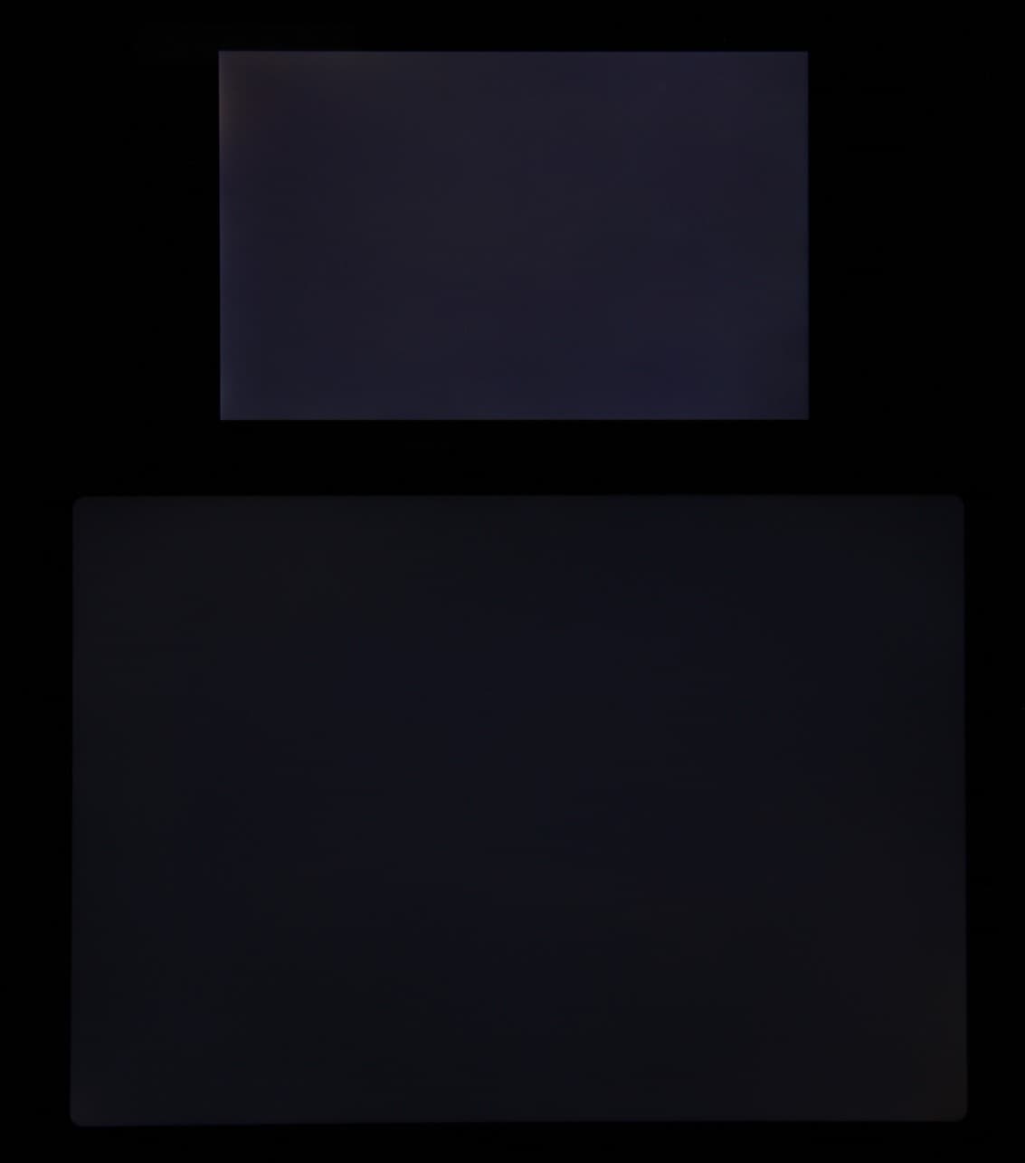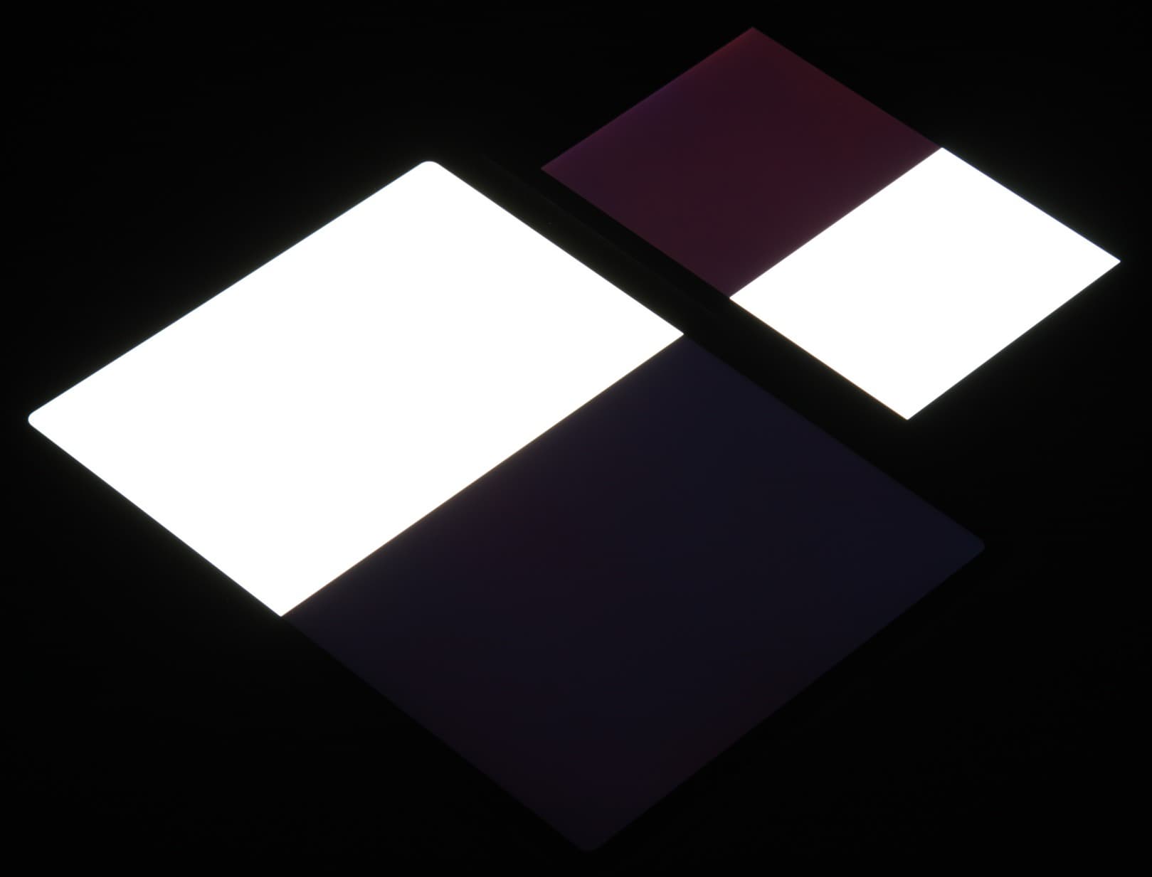Яркость под углом у экранов уменьшилась (как минимум в 5 раз, исходя из разницы в выдержке), но в случае iPad Pro 11″ падение яркости меньше. Черное поле при отклонении по диагонали высветляется очень слабо и приобретает фиолетовый оттенок. Фотографии ниже это демонстрируют (яркость белых участков в перпендикулярном плоскости экранов направлении примерно одинаковая!):
