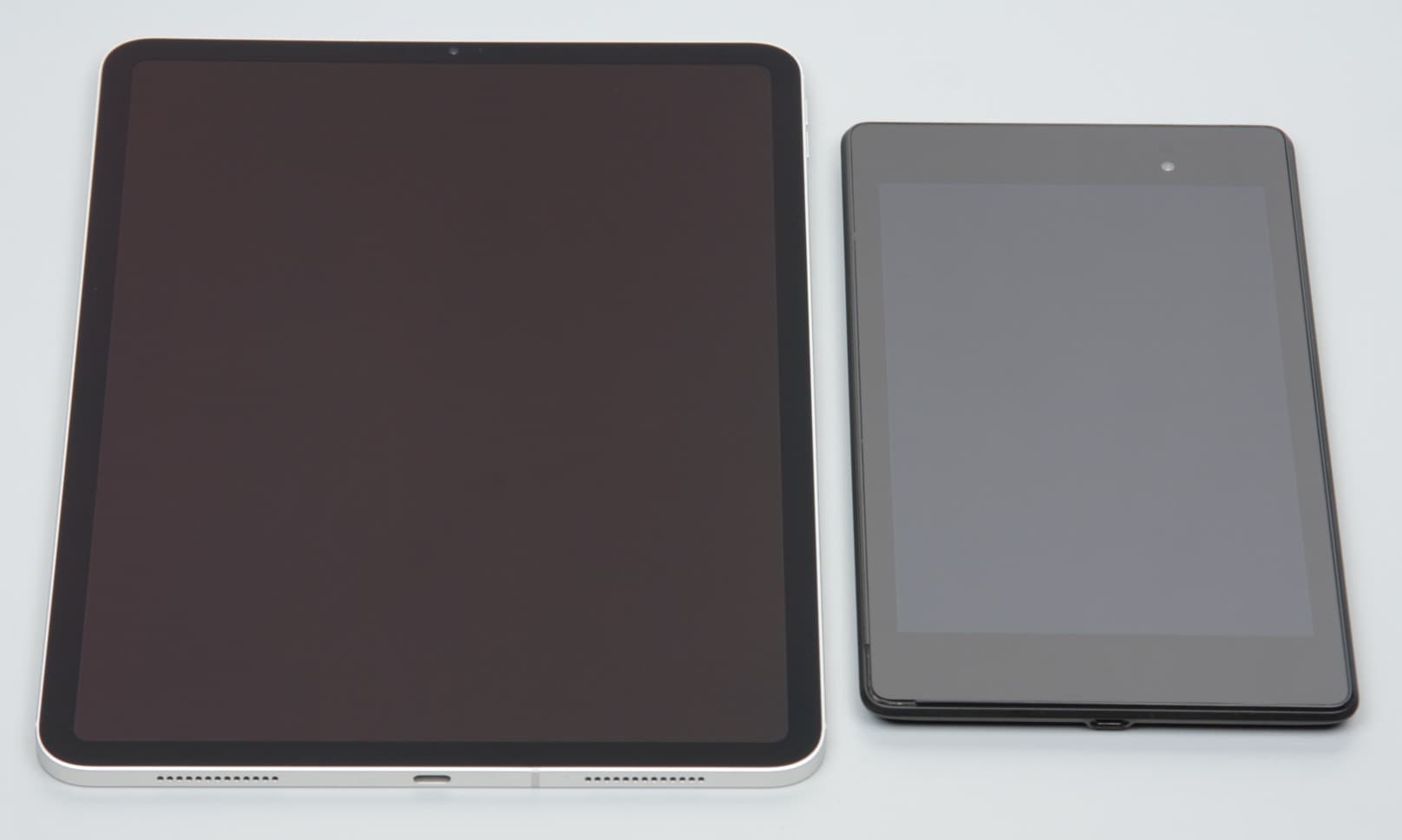 Лицевая поверхность экрана выполнена в виде стеклянной пластины с зеркально-гладкой поверхностью, устойчивой к появлению царапин. Судя по отражению объектов антибликовые свойства экрана гораздо лучше, чем у экрана Google Nexus 7 (2013) (далее просто Nexus 7). Для наглядности приведем фотографию, на которой в выключенных экранах отражается белая поверхность (справа — Nexus 7, слева — iPad Pro 11″, далее их можно различать по размеру):