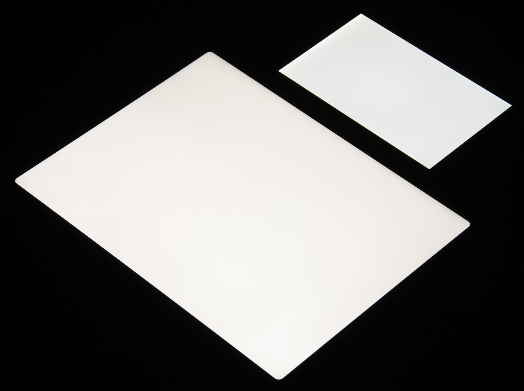 Яркость под углом у экранов уменьшилась (как минимум в 5 раз, исходя из разницы в выдержке), но в случае iPad Pro 12,9″ падение яркости меньше. Черное поле при отклонении по диагонали высветляется очень слабо и приобретает фиолетовый оттенок. Фотографии ниже это демонстрируют (яркость белых участков в перпендикулярном плоскости экранов направлении примерно одинаковая!):