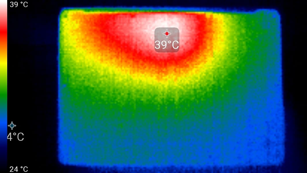 Ниже приведены теплоснимки, полученные после 15 минут работы теста аккумулятора в программе GFXBench Metal. Температура окружающей среды составляла 24 градуса.