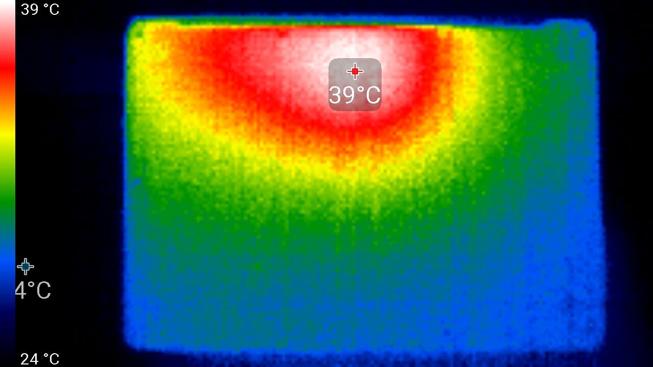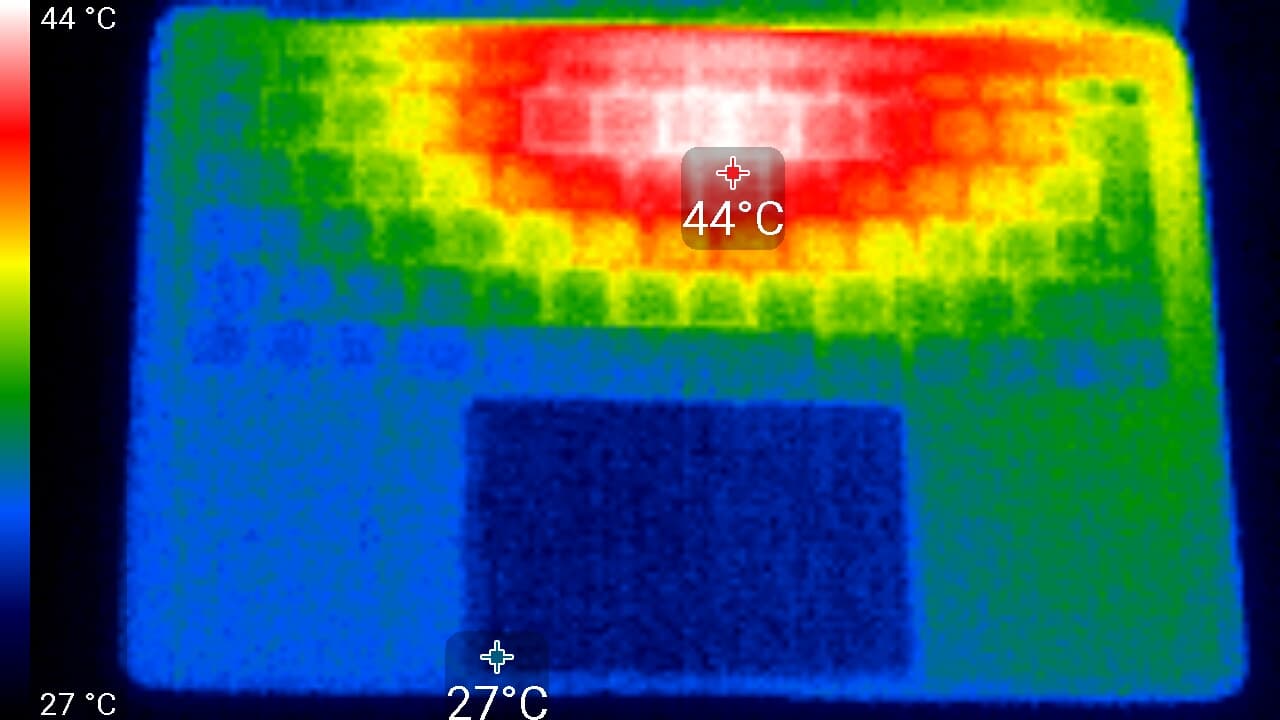 Максимальный нагрев — это область, расположенная немного ближе к экрану от центра клавиатуры. Там, где обычно находятся запястья пользователя, нагрев незначительный, что повышает комфорт от работы за ноутбуком.