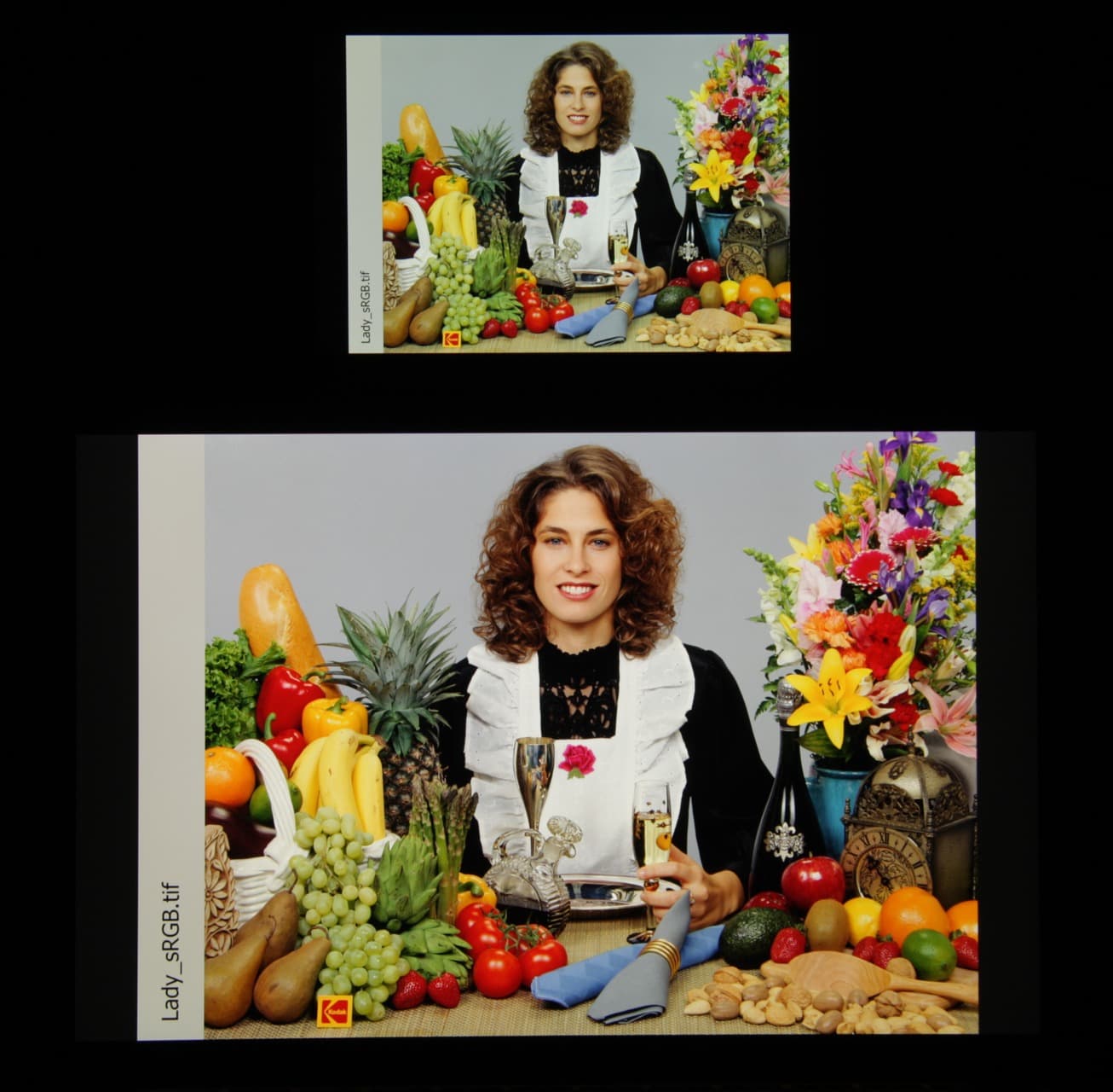 В итоге визуально цвета имеют естественную насыщенность. Заметим, что такие спектры с относительно узким пиком синего и с широкими горбами зеленого и красного цветов характерны для экранов, в которых используется светодиодная подсветка с синим излучателем и желтым люминофором. Цветовой охват в случае тестовых изображений с профилем Display P3 лишь чуть-чуть больше sRGB: