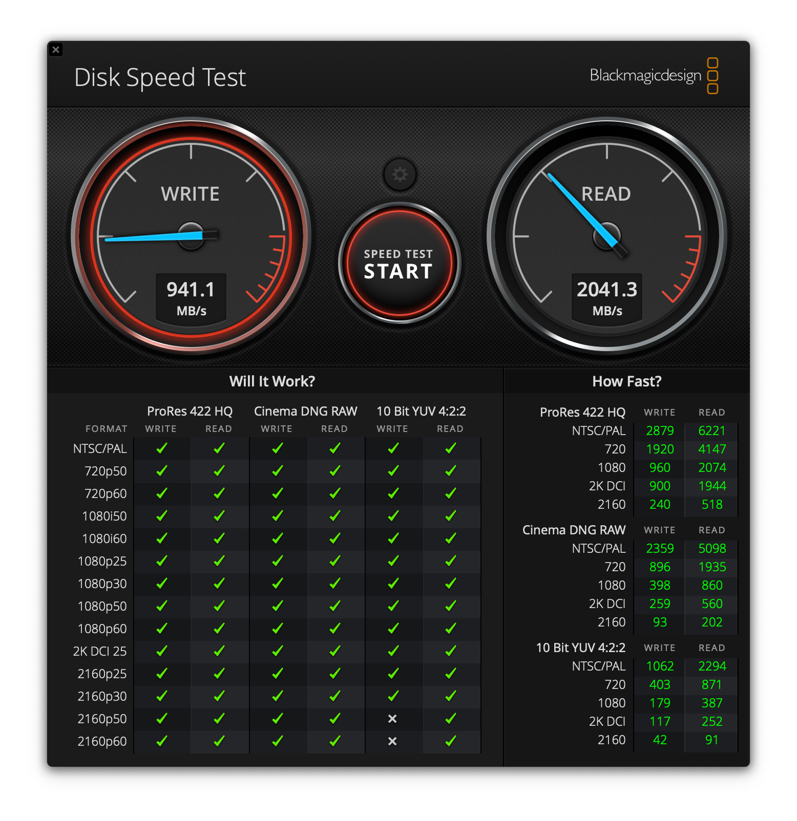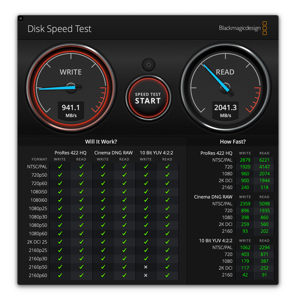 Если перечисленные выше бенчмарки помогают нам оценить производительность CPU и GPU, то BlackMagic Disk Speed ориентирован на тестирование накопителя: он измеряет скорости чтения и записи файлов.