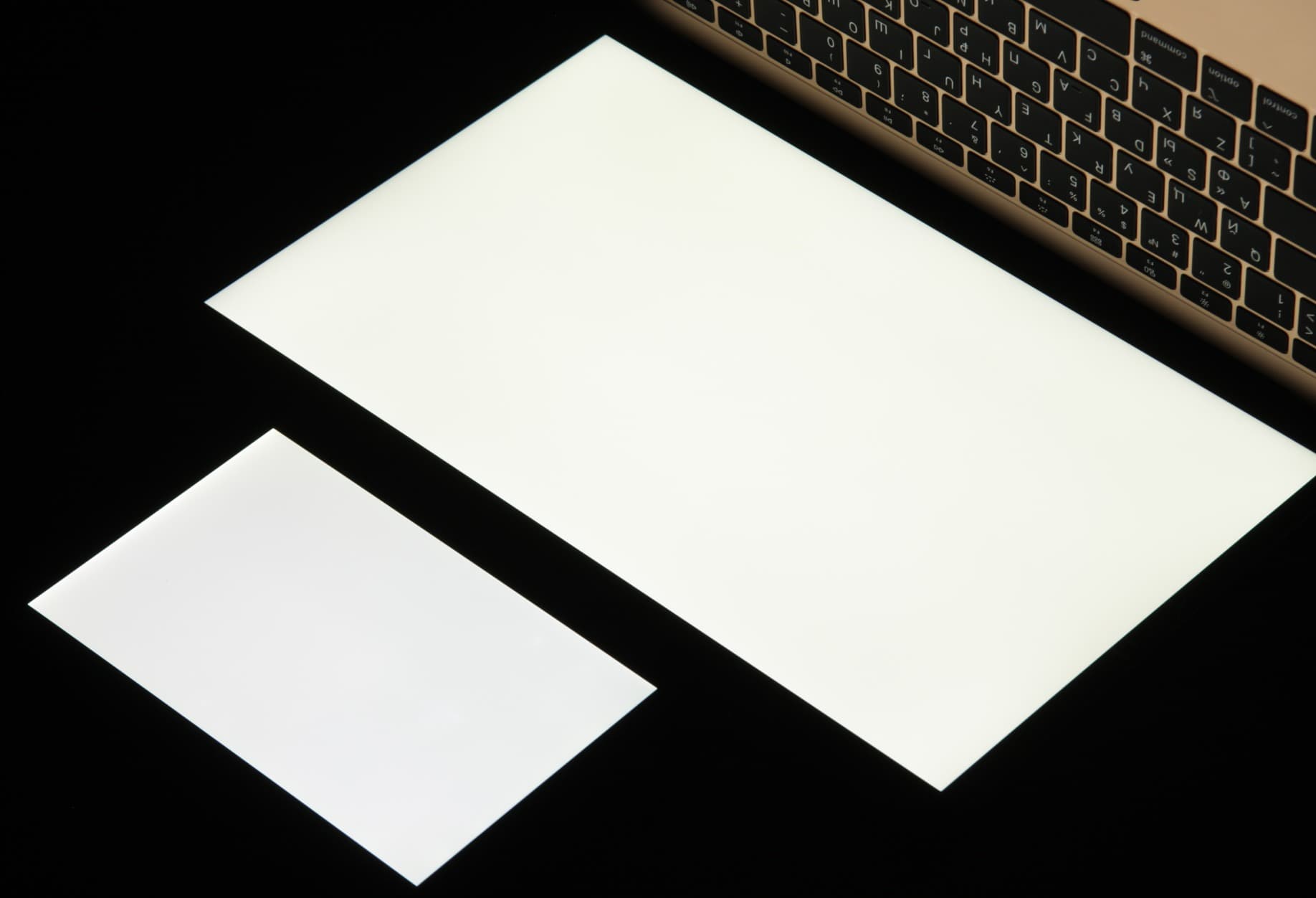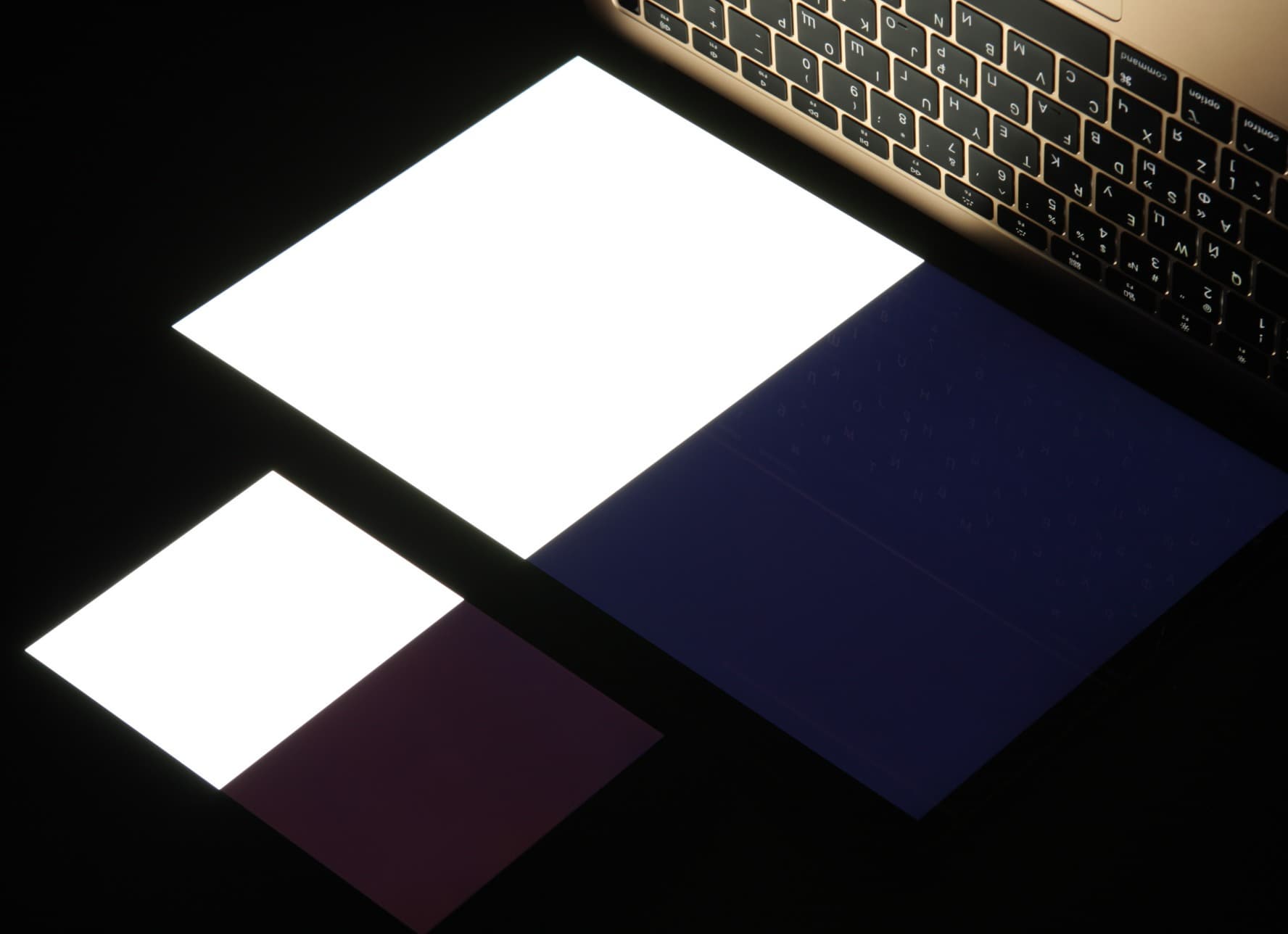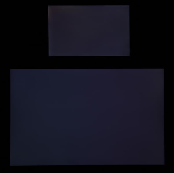 Яркость под этим углом у обоих экранов заметно уменьшилась (выдержка увеличена в 5 раз), но экран MacBook Air все же светлее. Черное поле при отклонении по диагонали высветляется слабо и приобретает легкий фиолетовый оттенок. Фотография ниже это демонстрирует (яркость белых участков в перпендикулярном плоскости экранов направлении примерно одинаковая!):