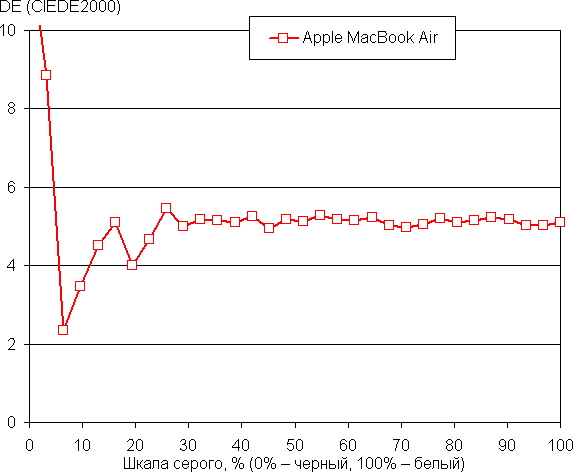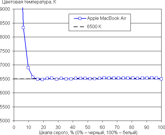 Подведем итоги. Экран ноутбука MacBook Air имеет не очень высокую максимальную яркость, но обладает великолепными антибликовыми свойствами, поэтому устройством можно будет пользоваться вне помещения даже летним солнечным днем. В полной темноте яркость можно понизить до комфортного уровня. Допустимо использовать и режим с автоматической подстройкой яркости, работающий адекватно. К достоинствам экрана можно причислить отсутствие мерцания экрана, отличную равномерность черного поля, высокую стабильность черного к отклонению взгляда от перпендикуляра к плоскости экрана, цветовой охват sRGB и хороший цветовой баланс. Недостатков у экрана нет.