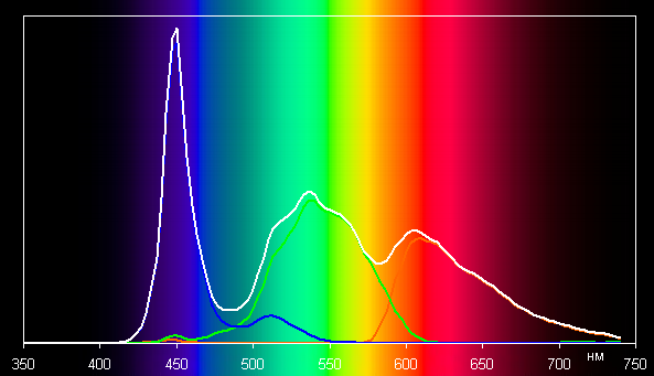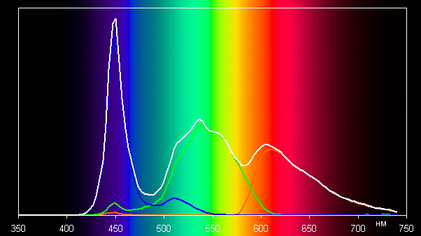 Спектры показывают, что светофильтры матрицы плюс программная коррекция в умеренной степени подмешивают основные цвета друг к другу: