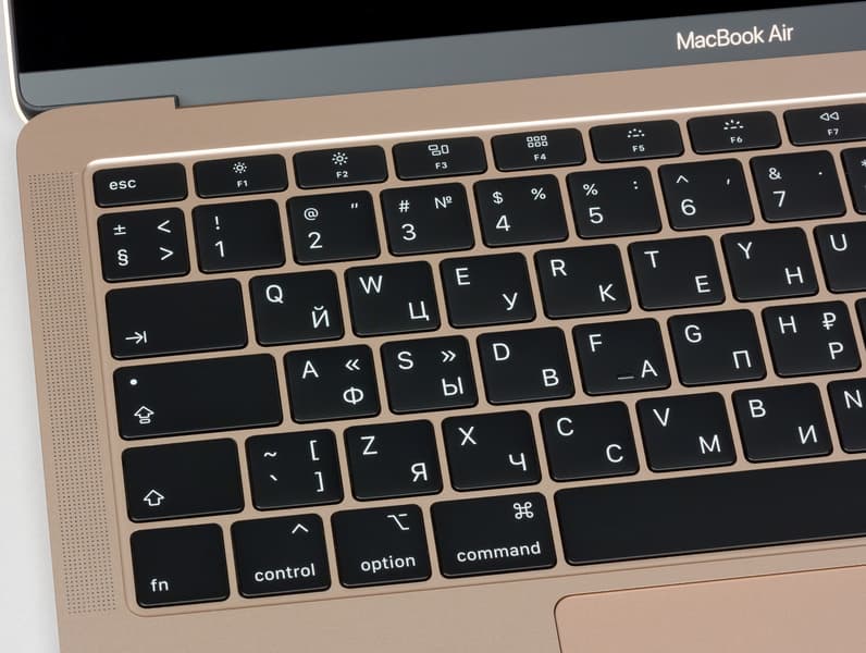 Здесь похожий цельнометаллический корпус, который сужается к клавиатуре, полноразмерная клавиатура с клавишами типа «бабочка», динамики справа и слева от нее, узкие рамки вокруг экрана. Есть ощущение, что ход клавиш здесь чуть-чуть больше, чем у 12-дюймового MacBook.