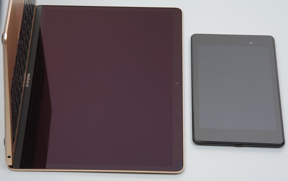 Экран имеет хорошие углы обзора без значительного сдвига цветов даже при больших отклонениях взгляда от перпендикуляра к экрану и без инвертирования оттенков. Для сравнения приведем фотографии, на которых на экраны MacBook Air и Nexus 7 выведены одинаковые изображения, при этом яркость экранов изначально установлена примерно на 200 кд/м² (по белому полю во весь экран), а цветовой баланс на фотоаппарате принудительно переключен на 6500 К. Перпендикулярно к экранам белое поле: