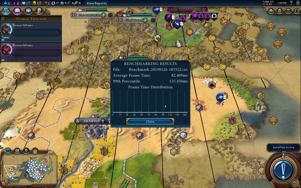 Для тестирования производительности в играх мы в новой версии методики используем встроенный бенчмарк Civilization VI. Он выводит два показателя: Average Frame Time и 99th Percentile.
