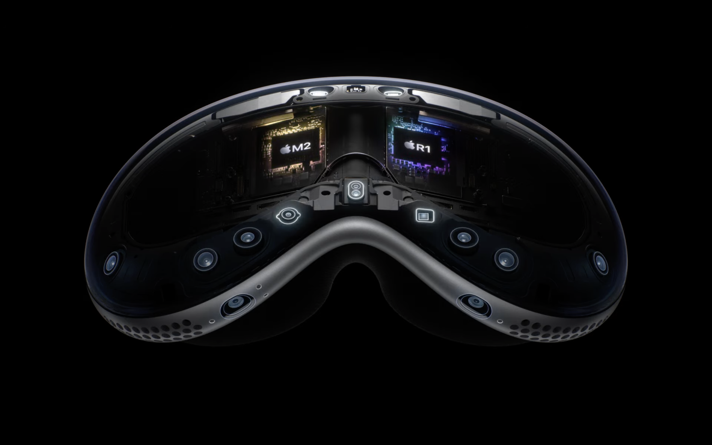 Далее, в гарнитуре используются сразу два чипа: уже известная нам по ноутбукам SoC Apple M2 и совершенно новая Apple R1, которая нужна для обработки в режиме реального времени данных с 12 камер, 5 сенсоров, а также 6 микрофонов. И да, устройство буквально нашпиговано камерами и датчиками. В этом смысле ничего сопоставимого у Apple не было. И здесь возникает еще один вопрос: а насколько вся эта конструкция хрупкая? Насколько критичны для нее падения или, например, возможные удары при перевозке?
