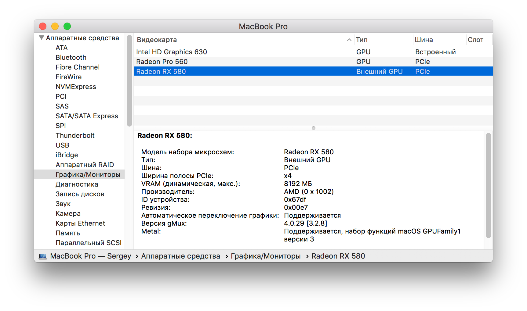 И там наряду с интегрированной Intel HD Graphics 630 и дискретной Radeon Pro 560 отображается также Radeon RX 580 с пометкой «Внешний GPU». Итак, все работает, причем безо всяких драйверов и прочих усилий со стороны пользователя. Важно также отметить, что пользователю не нужно вручную переключать компьютер на работу с внешней видеокартой: при ее подсоединении она автоматически становится приоритетной.