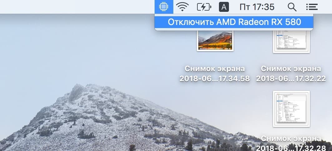 Итак, подключаем видеокарту с помощью кабеля USB-C к ноутбуку. И сразу видим, как в правом верхнем углу на строке Menu рядом с иконкой Wi-Fi появляется новый значок: