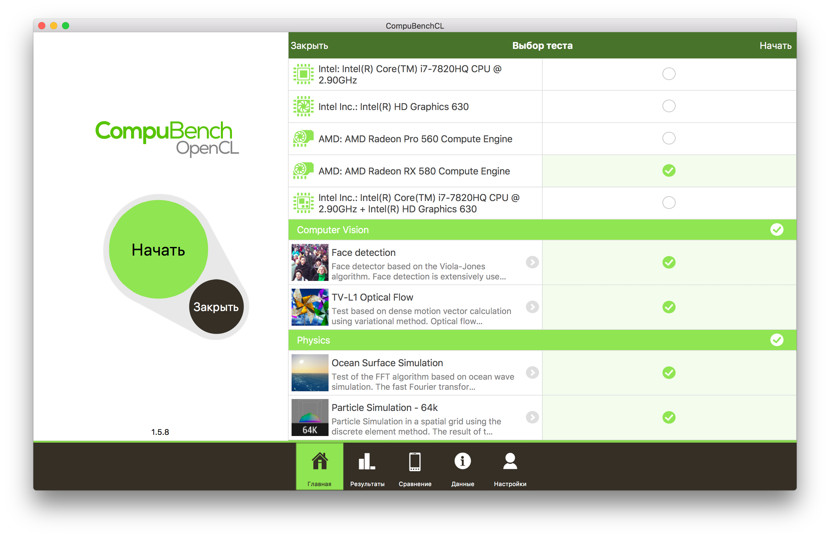 В комплексном бенчмарке Geekbench 4 нас интересует только один тест: Compute. В нем, однако, есть два подтеста: Metal и OpenCL. Кроме того, перед тестированием мы можем выбрать любой из имеющихся в наличии графических ускорителей. Все результаты — в таблице.