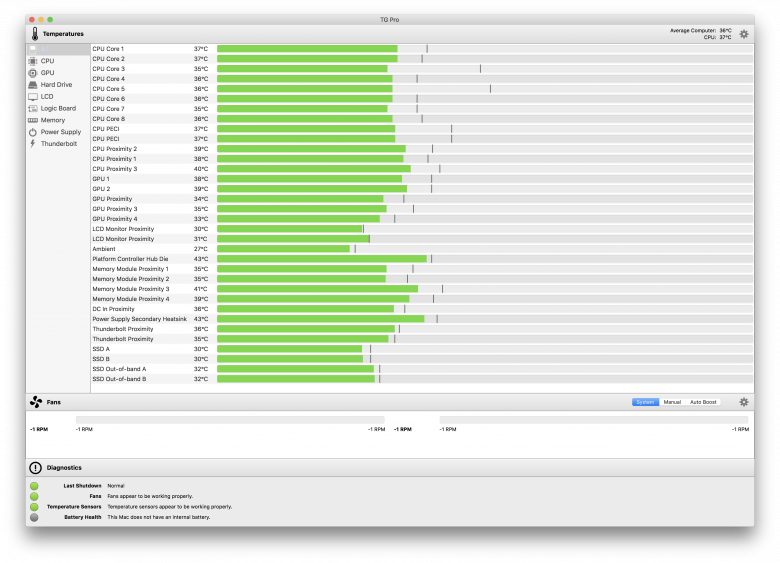 Вообще iMac Pro оказался на удивление тихой и холодной машинкой. Судя по данным Tunabelly TG Pro, базовая рабочая температура процессорных и графических ядер — в диапазоне 33-39 градусов по Цельсию. В основном — 35-36 градусов.