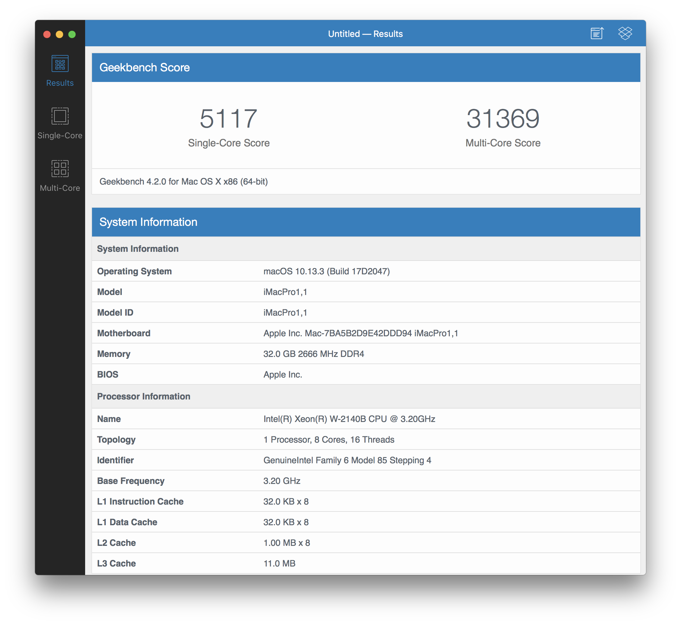 Geekbench — специализированный бенчмарк, призванный продемонстрировать максимум того, на что способно «железо». И его результаты абсолютно соответствуют теории: в одноядерном режиме Xeon W-2140B проигрывает быстрому Core i7-7700К, но с существенным отрывом (опять-таки примерно в полтора раза) выигрывает в многоядерном. Core i7-6820HQ (в MacBook Pro 15″) не имеет превосходства над соперниками ни по числу ядер (те же 4/8), ни по их частоте (2,7/3,6 ГГц), и это тоже вполне наглядно демонстрируют результаты Geekbench 4.