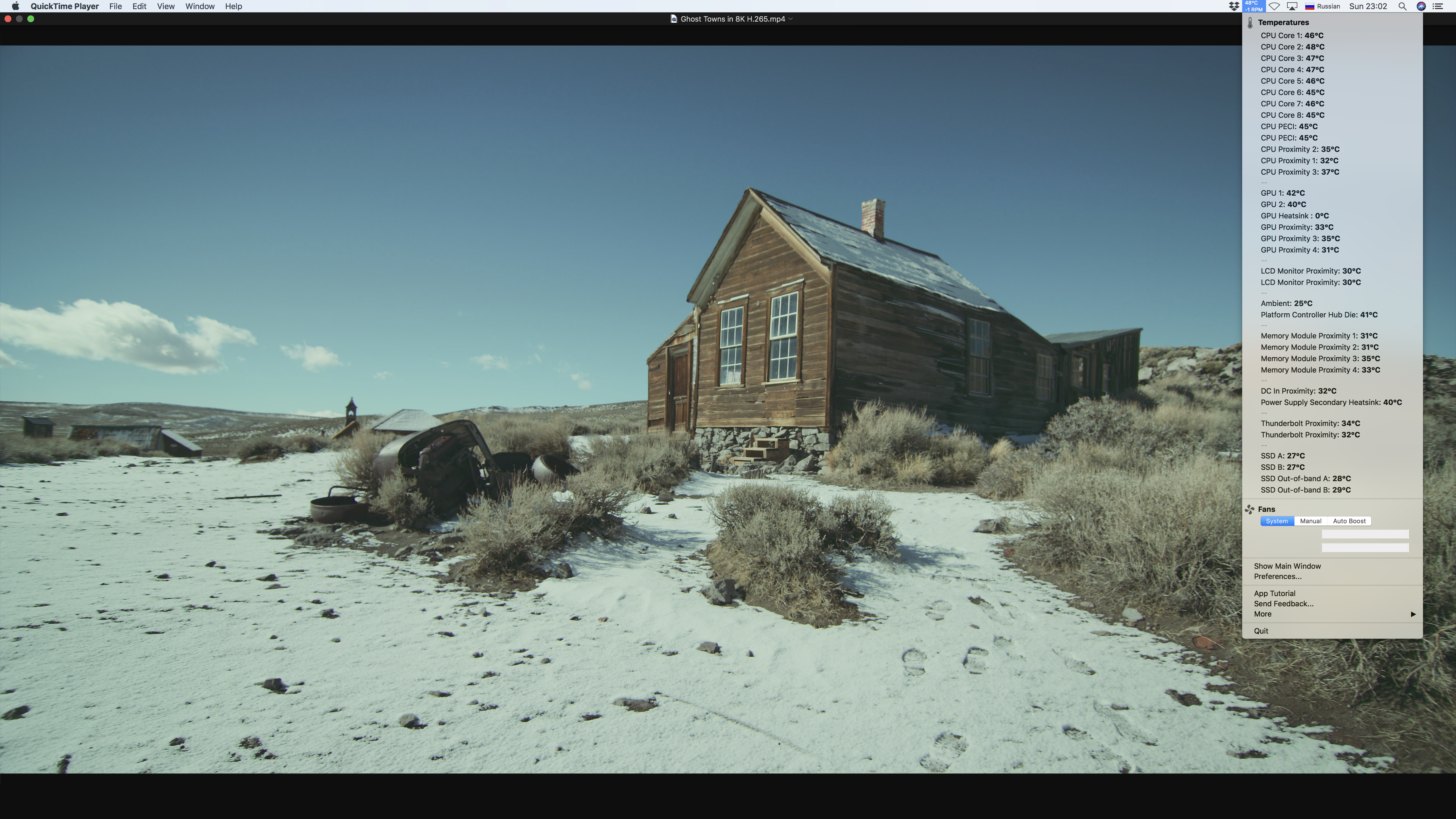 При воспроизведении в QuickTime Player видео 8К (H.265) температура поднималась до 46-48 градусов.