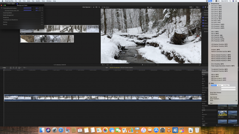 При попытках максимально разогреть iMac Pro реальными приложениями (например, видеомонтажом в Final Cut Pro X) мы получали что-то в районе 70 градусов, что является более чем приемлемым результатом. Шум при этом если и появлялся, то минимальный.
