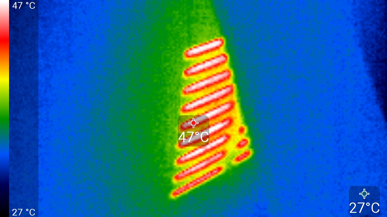 Пиковое потребление системы составило 320 Вт. Нагрев задней панели можно оценить по снимку, полученному с помощью теплокамеры: