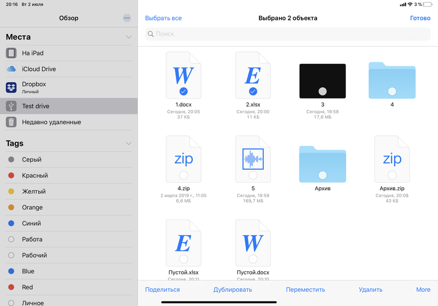 Да-да, в iPad наконец-то можно полноценно (ну, почти) работать с флэшками. И здесь опять-таки надо оглянуться назад. Раньше в iOS была возможность импорта фотографий с карт памяти камер (для этого требовался соответствующий переходник на Lightning), а в 2018 году, после появления разъема USB-C в планшетах iPad Pro, появилась возможность подключения флэшек напрямую. Но, строго говоря, толку от этого было мало — а всё из-за программных ограничений. Теперь они сняты.