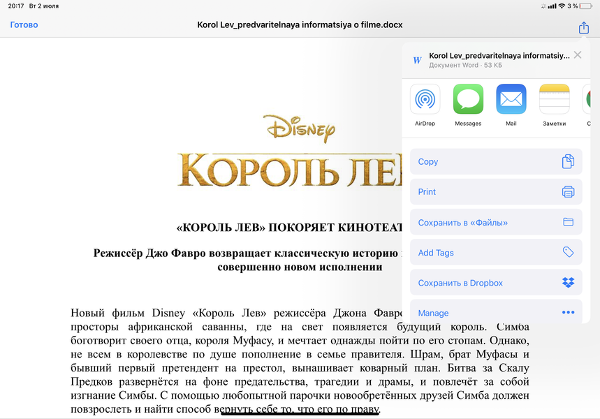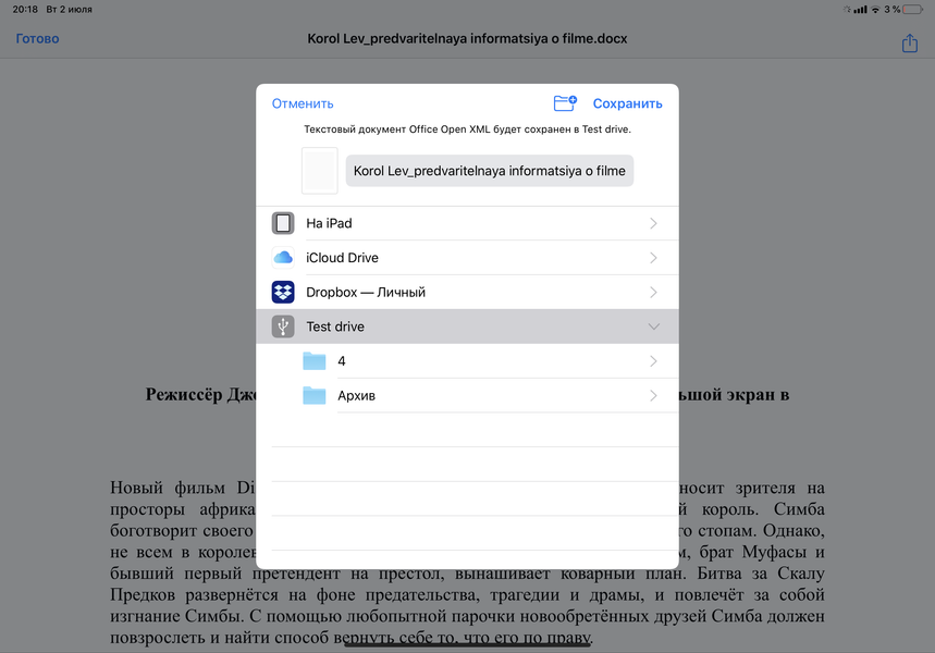 Точно так же можно посмотреть и документы, но здесь есть нюанс. Если вы откроете с флэшки, например, файл DOCX, то даже при наличии приложений Word и Pages на планшете этот файл у вас откроется просто через встроенный просмотрщик (так же, как если бы вы открыли вложение в письме). То есть вы не сможете его отредактировать. Для того чтобы отредактировать этот файл, надо действовать иначе. Запустить текстовый редактор, через него открыть файл с флэшки (в Pages это Обзор / Места), затем отредактировать и сохранить на флэшку же (Поделиться / Сохранить в «Файлы»).