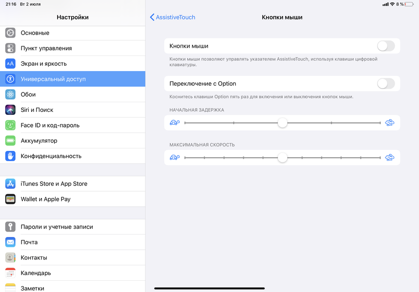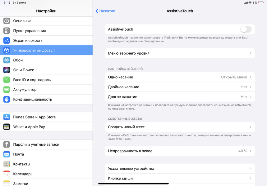 Впрочем, этот шаг был хитро закамуфлирован. Для того, чтобы включить мышь (например, подключенную по Bluetooth), надо зайти в Настройки / Универсальный доступ / AssistiveTouch. Пояснение «AssistiveTouch позволяет использовать iPad, если вы не можете дотрагиваться до экрана или вам необходимо адаптивное оборудование», ни словом не дает понять, что это то, что надо. И тем не менее, требуемая опция именно там.