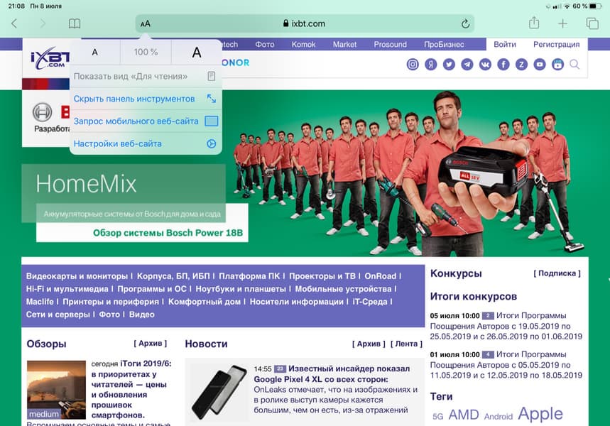Минус же заключается в том, что десктопные версии многих сайтов пока некорректно выглядят на iPadOS. В чем проблема: в самих сайтах или недоработках Safari? Напомним, iPadOS еще пока в бета-версии, так что какие-то проблемы наверняка будут устранены к осеннему релизу. Да и веб-ресурсы наверняка подтянутся и оптимизируют работу на iPadOS (хотя, конечно, не все и не сразу). Но пока работа не столь комфортна: бывает, что сайт сильно «вылезает» за пределы экрана, блоки мешают друг другу, на кнопки и иконки невозможно нажать...