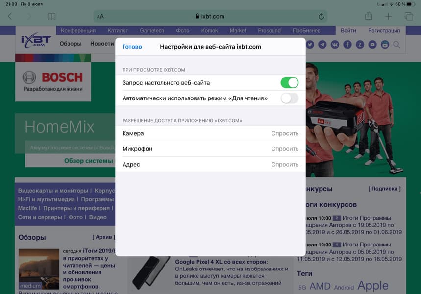 По умолчанию включена десктопная версия. При этом, если вы включите мобильный сайт, а затем откроете новую вкладку, она все равно будет десктопной. Ну, может, оно и неплохо — постепенно разработчики сайтов перестанут надеяться на то, что на iPad их сайт будет выглядеть как-то иначе, и станут оптимизировать настольную версию для всех типов устройств.
