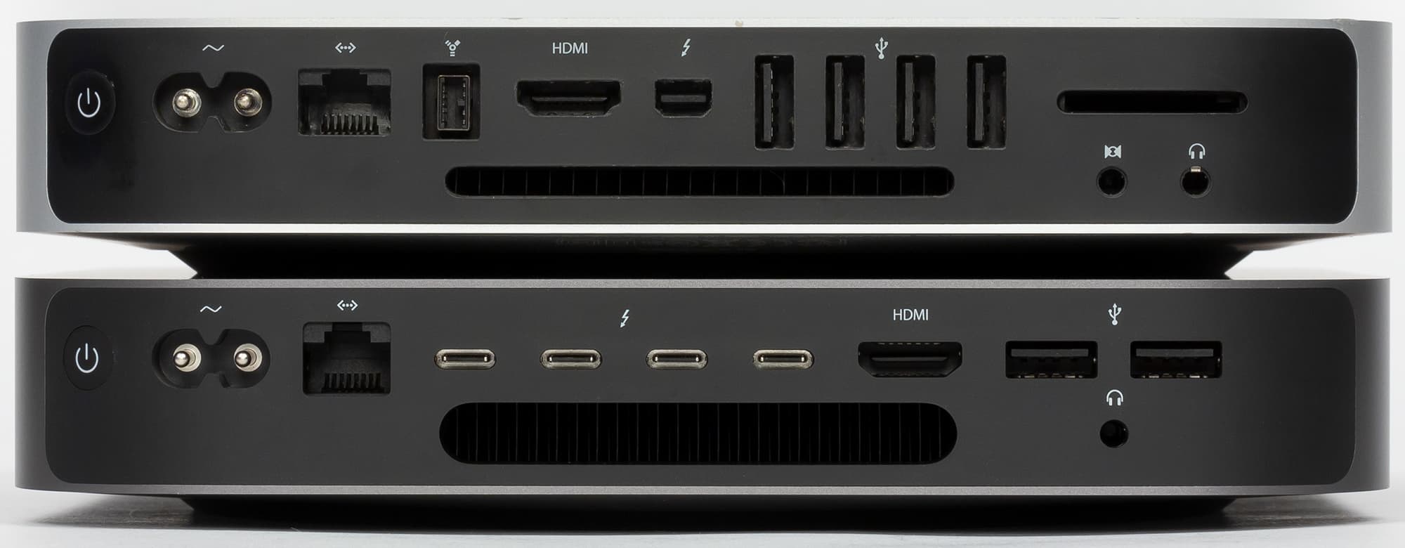 Но главное обновление дизайна связано, конечно, не с цветом, а с набором разъемов на задней панели. Там теперь четыре порта Thunderbolt 3 с разъемом USB-C, два USB 3.1 второго поколения с разъемом USB-A, а также HDMI 2.0, гигабитный Ethernet (на заказ можно установить 10-гигабитный) и совмещенный миниджек 3,5 мм. Благодаря наличию высокоскоростного Thunderbolt 3 к Mac mini можно подключить внешнюю видеокарту (о том, как это делается и какой эффект дает, мы недавно рассказывали). На фото ниже можно увидеть набор разъемов на новом (снизу) и старом (сверху) Mac mini.