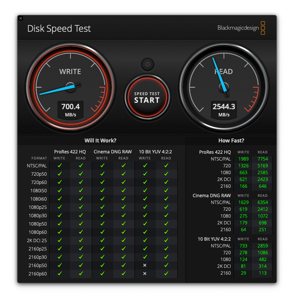 Если перечисленные выше бенчмарки помогают нам оценить производительность CPU и GPU, то BlackMagic Disk Speed ориентирован на тестирование накопителя: он измеряет скорости чтения и записи файлов.