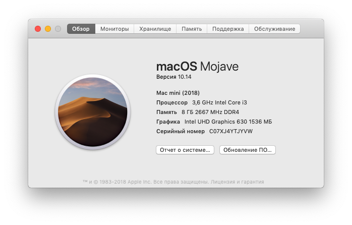 Нам на тест приехала базовая модель в минимальной конфигурации. Стоимость ее на официальном сайте Apple — 69 тысяч рублей. Фактически, это на сегодняшний день самый дешевый компьютер под управлением macOS — тем эта конфигурация и интересна. Ее основа — четырехъядерный процессор Intel Core i3-8100 (Coffee Lake). Этот процессор имеет базовую тактовую частоту 3,6 ГГц; режима Turbo Boost у него нет. Размер его кэша L3 составляет 6 МБ, а расчетная максимальная мощность — 65 Вт. В процессор интегрировано графическое ядро Intel UHD Graphics 630, дискретная графика в Mac mini не предусмотрена — ни в каких конфигурациях.