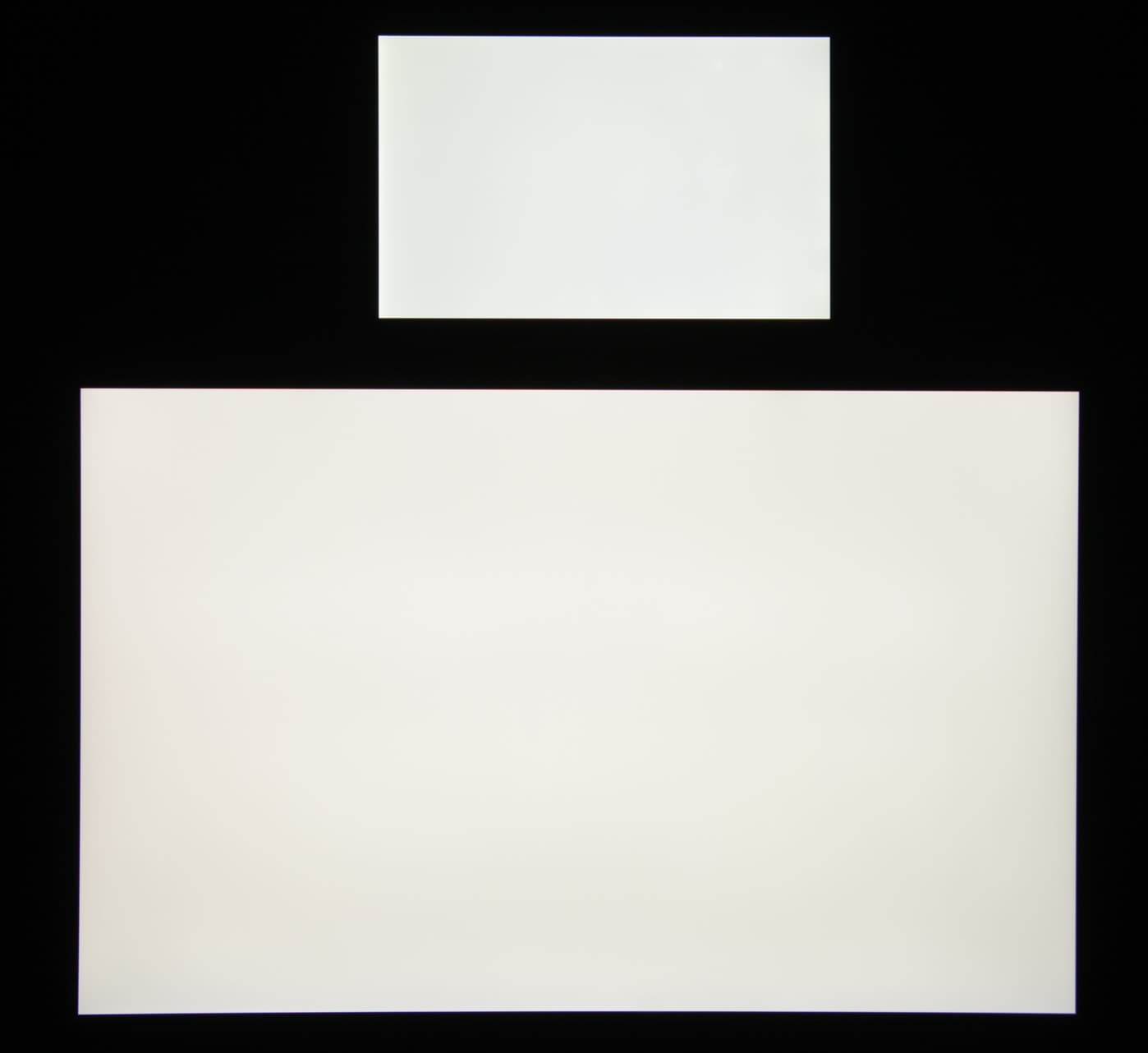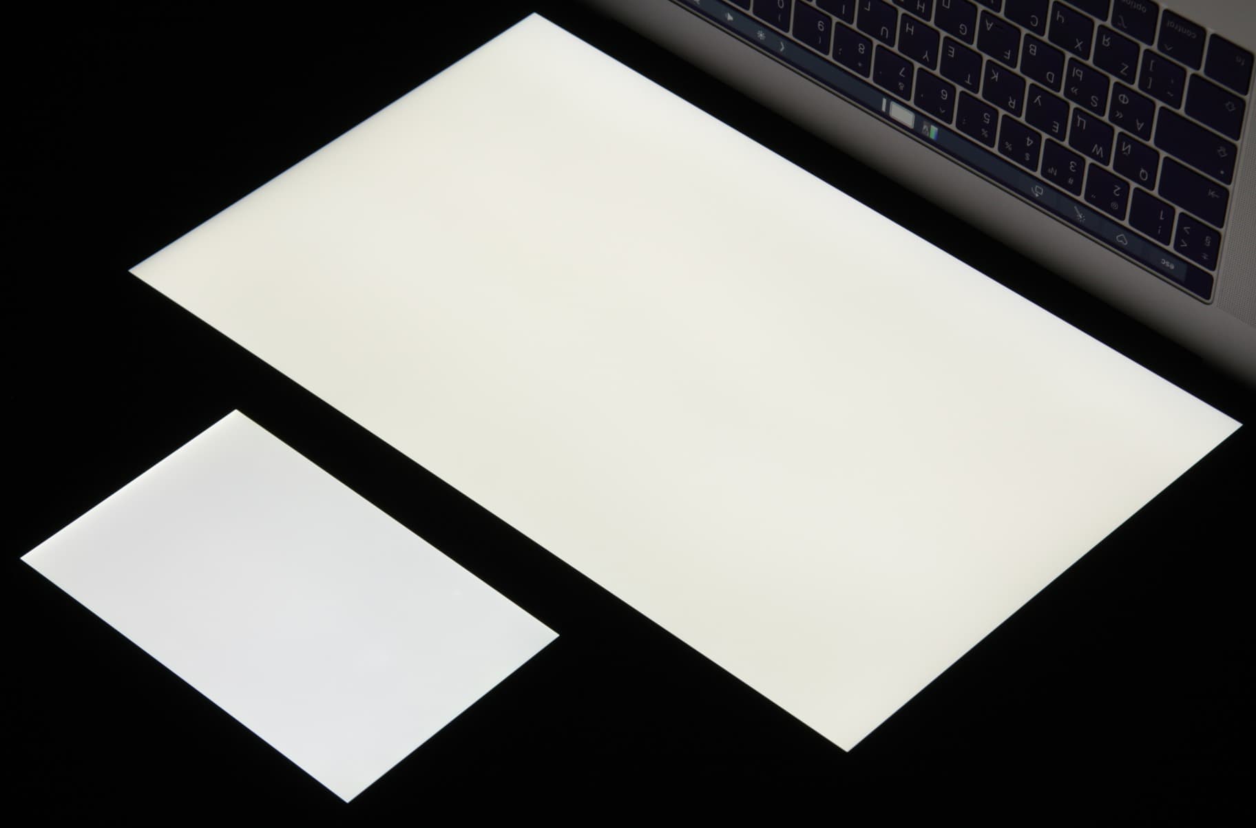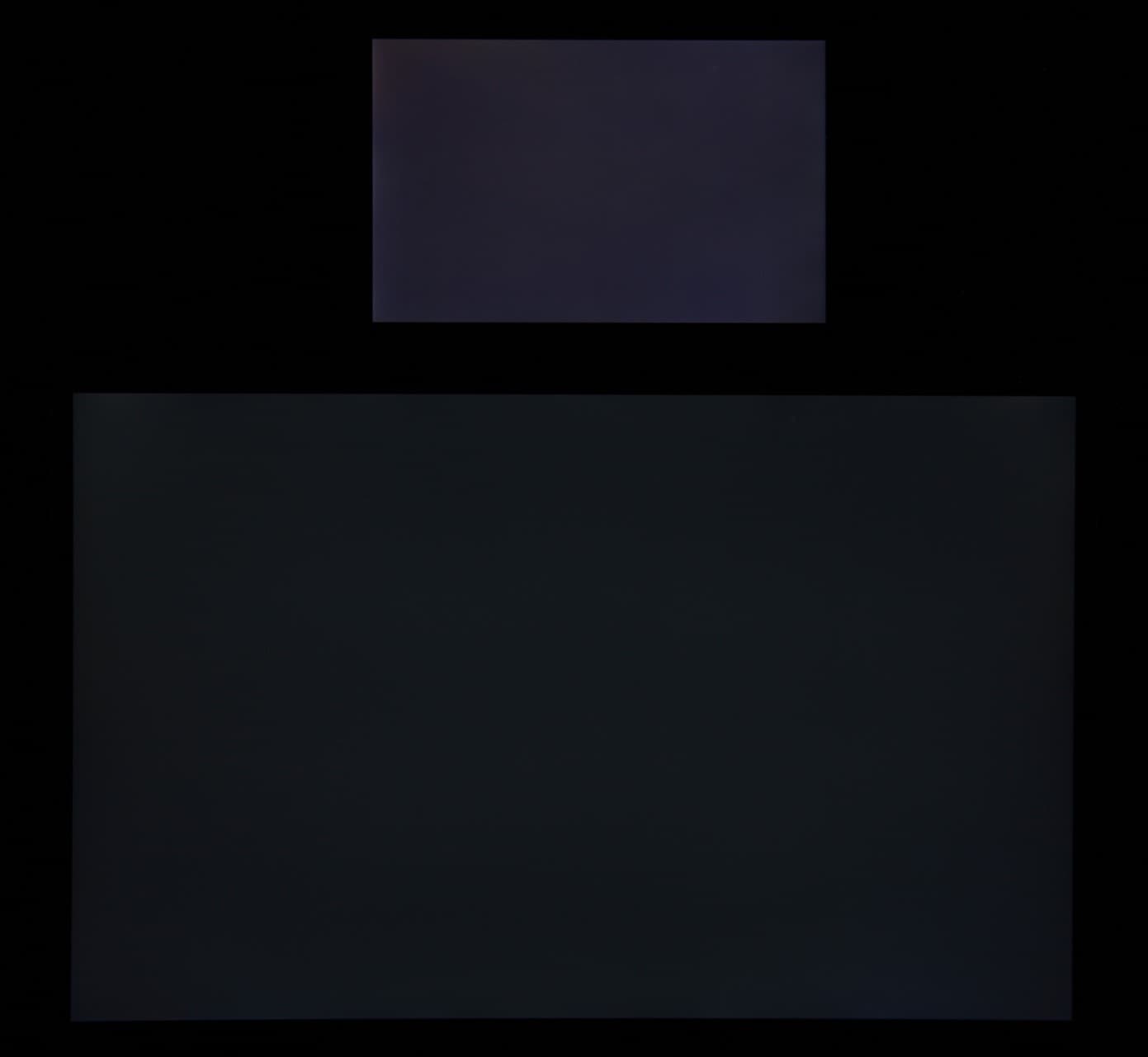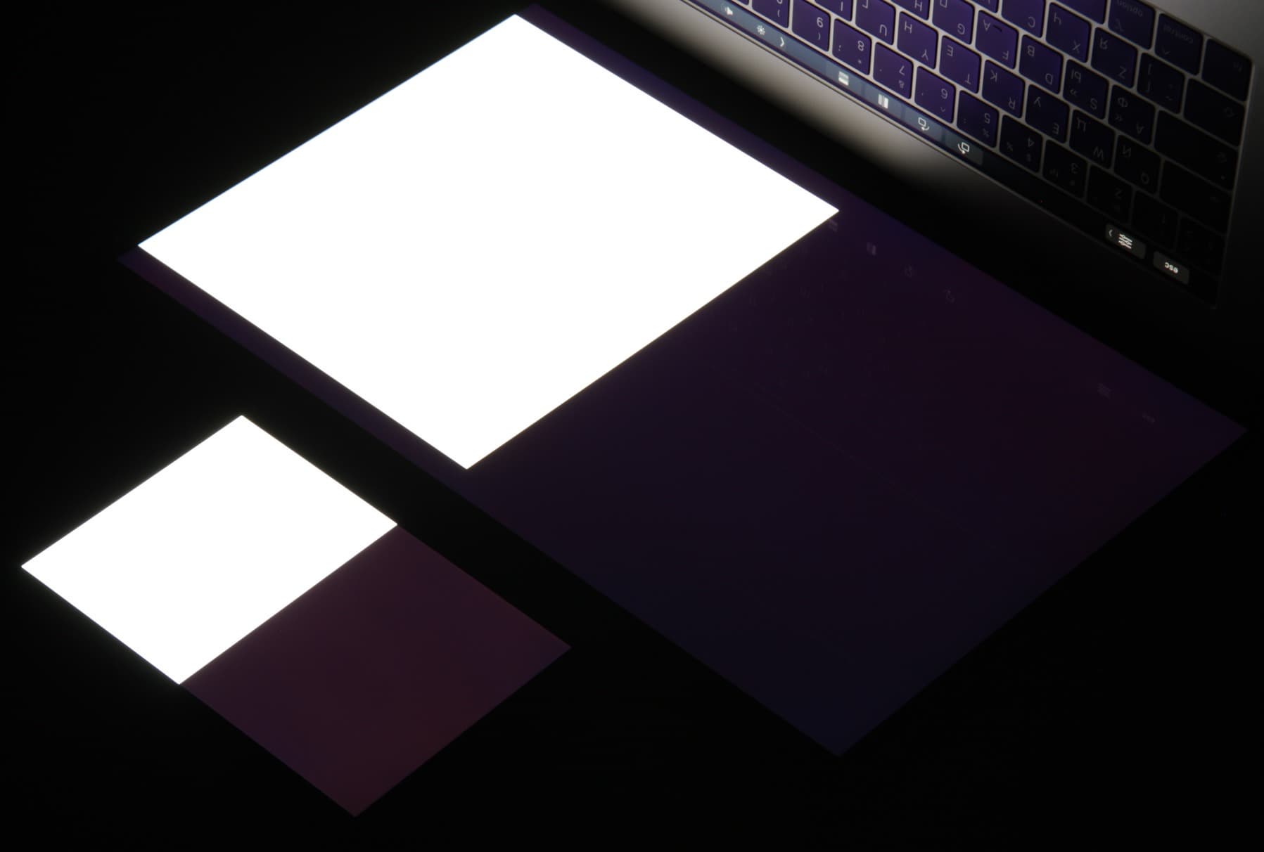 Яркость под этим углом у обоих экранов заметно уменьшилась (выдержка увеличена в 5 раз), но экран MacBook Pro все же светлее. Черное поле при отклонении по диагонали высветляется слабо и приобретает легкий красно-фиолетовый оттенок. Фотография ниже это демонстрирует (яркость белых участков в перпендикулярном плоскости экранов направлении примерно одинаковая!):