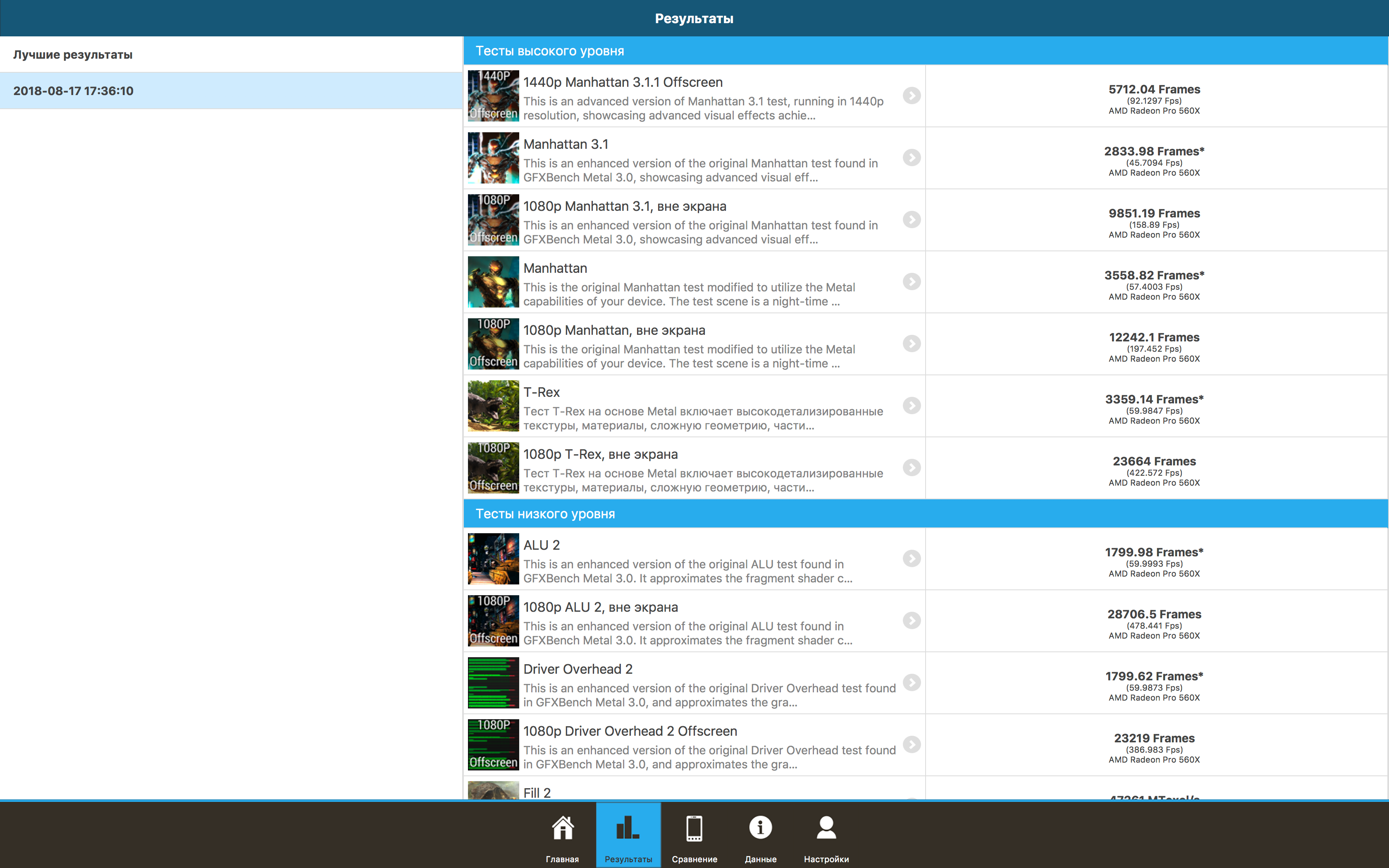 Далее у нас тестирование 3D-графики, и первым идет бенчмарк GFX Benchmark Metal.