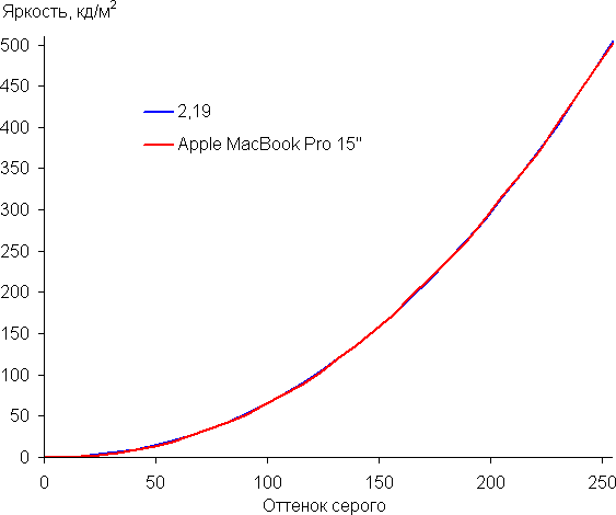 Также впервые в MacBook Pro присутствует функция True Tone, которая подстраивает цветовой баланс под условия окружающей среды. К примеру, мы ее активировали и поместили ноутбук под светодиодные светильники с холодным белым светом, получили в итоге значения 6,0 для ΔE и 6700 К для цветовой температуры. Под галогеновой лампой накаливания (теплый свет) — 2,6 и 5350 К, то есть цветовая температура стала ниже. Функция работает так, как и ожидалось. В полной темноте — 10 и 5800 К. Отметим, что сейчас сложившимся стандартом является калибровка устройств отображения к точке белого в 6500 К, но в принципе, коррекция под цветовую температуру внешнего света может принести пользу, если хочется добиться лучшего соответствия изображения на экране с тем, что видно на бумаге (или на любом носителе, на котором цвета формируются за счет отражения падающего света) в текущих условиях.