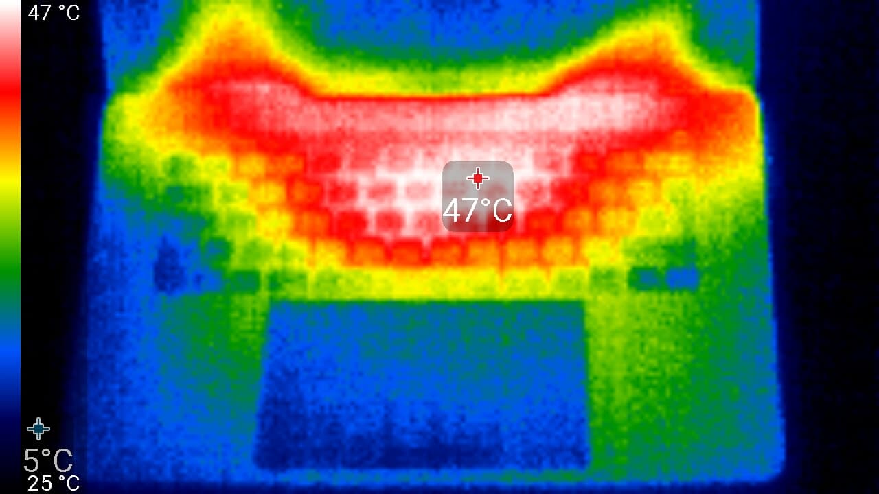 Максимальный нагрев — в области условно в центре клавиатуры. Там, где обычно находятся запястья пользователя, нагрев незначительный, что повышает комфорт от работы за ноутбуком. И снизу: