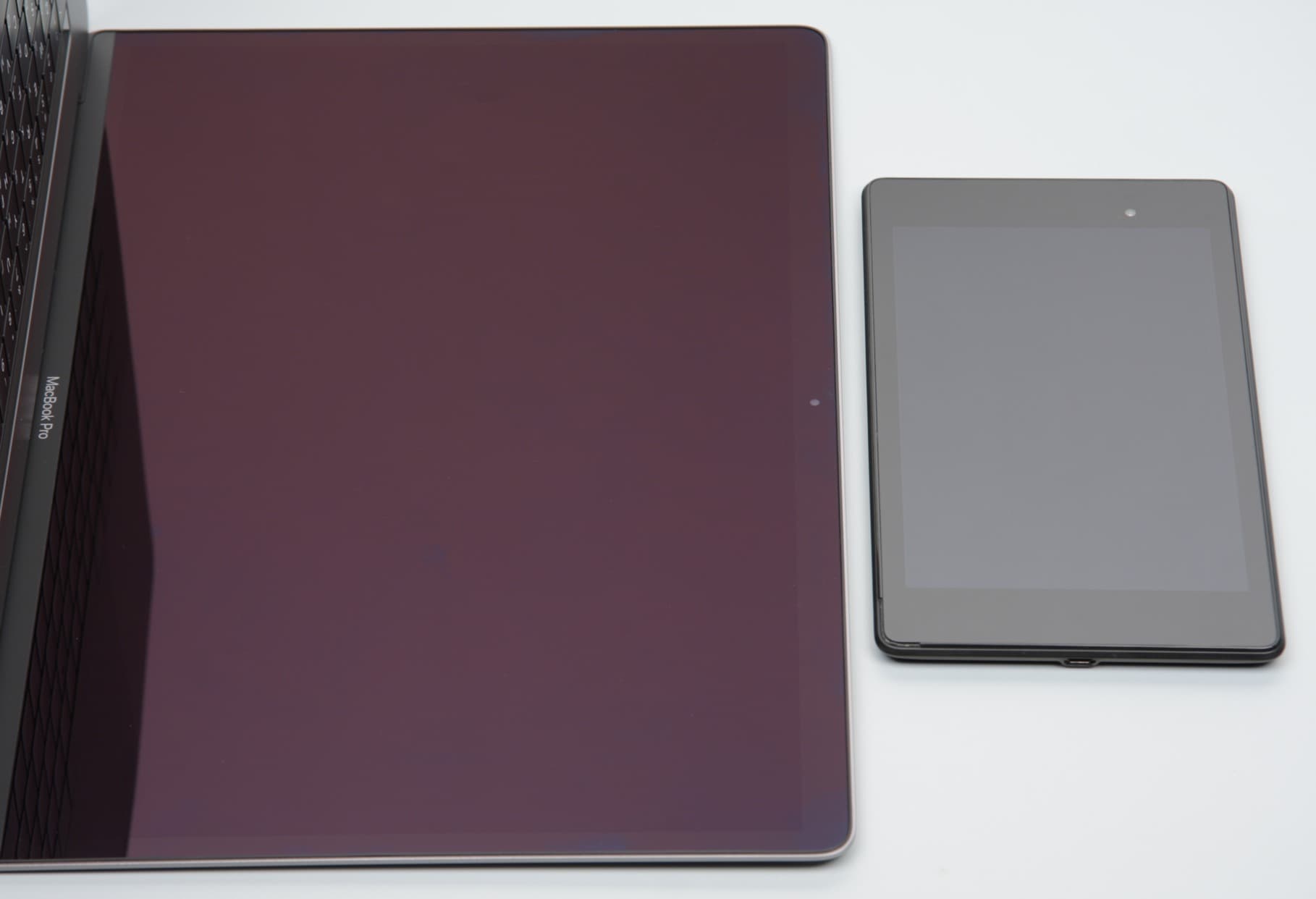 Экран имеет хорошие углы обзора без значительного сдвига цветов даже при больших отклонениях взгляда от перпендикуляра к экрану и без инвертирования оттенков. Для сравнения приведем фотографии, на которых на экраны MacBook Pro и Nexus 7 выведены одинаковые изображения, при этом яркость экранов изначально установлена примерно на 200 кд/м² (по белому полю во весь экран), а цветовой баланс на фотоаппарате принудительно переключен на 6500 К. Перпендикулярно к экранам белое поле: