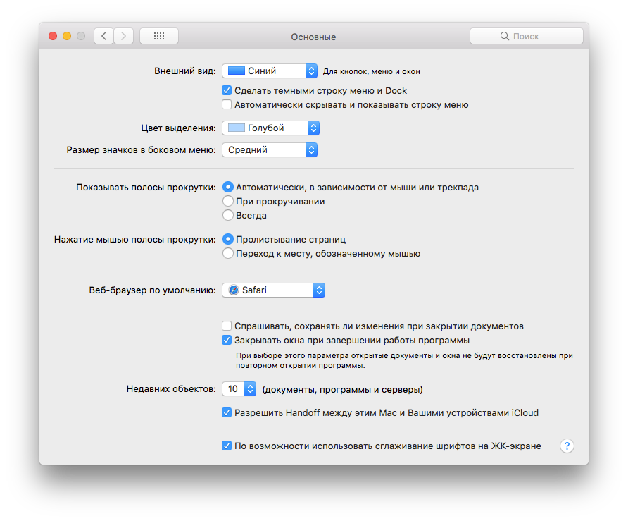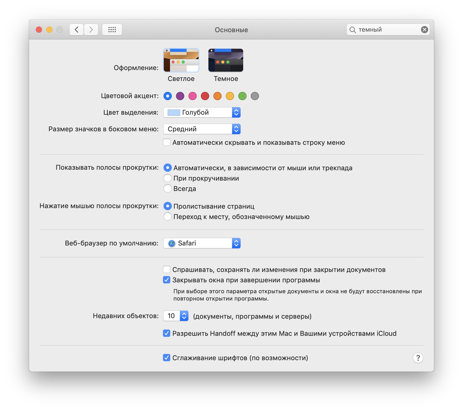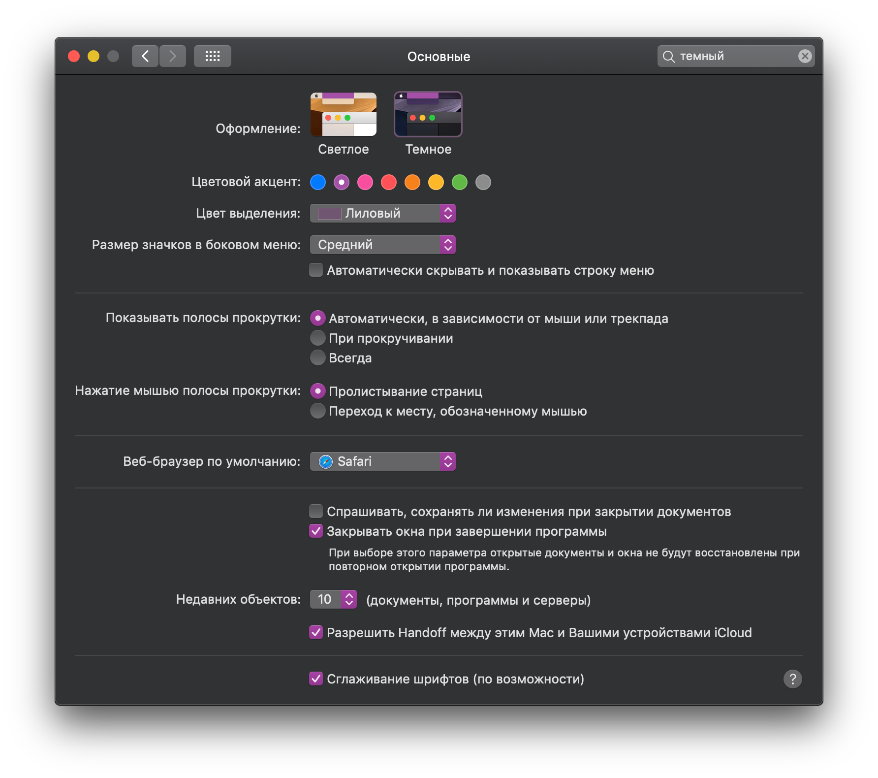 Кроме того, появился большой выбор «цветовых акцентов», то есть теперь вы можете изменить цвет кнопок, чекбоксов и стрелочек меню, выбирая из восьми вариантов. Раньше было доступно только два: синий (он стоял по умолчанию) и графит (серый металлик). Ниже — пример того же окна с лиловым цветовым акцентом.