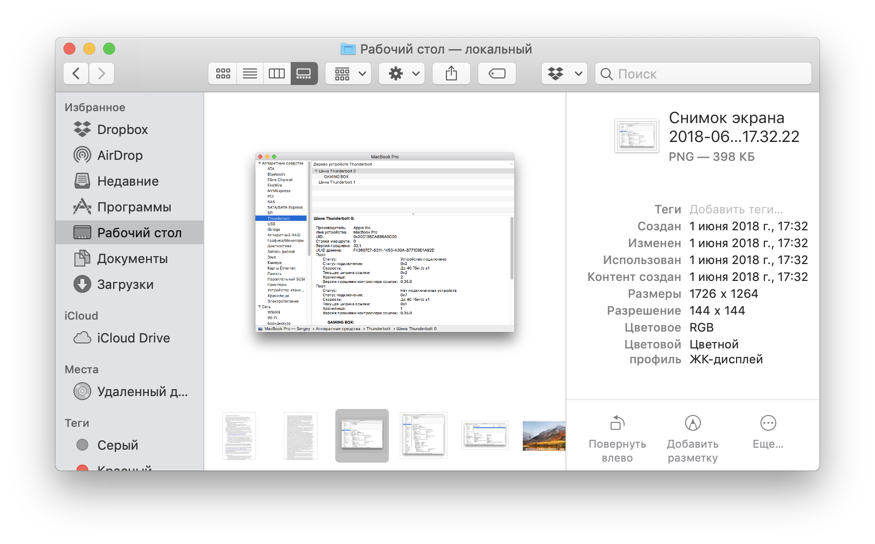 В Finder появился новый режим просмотра Gallery View. Интересно, что он заменил режим Cover Flow, который, похоже, больше не представлен в macOS. Главная особенность Gallery View — возможность листать миниатюры и тут же видеть подробную информацию, вплоть до данных EXIF для фото.