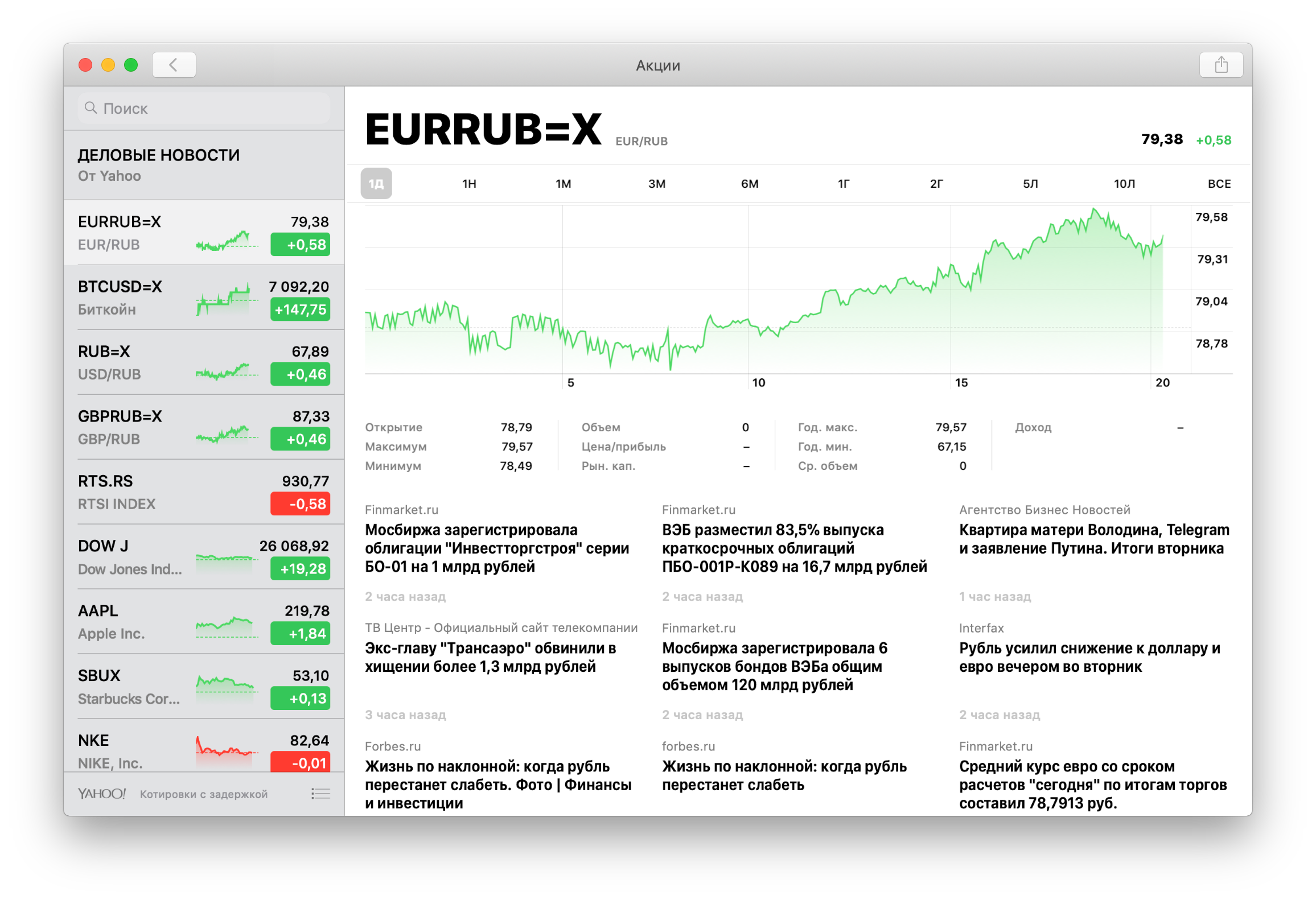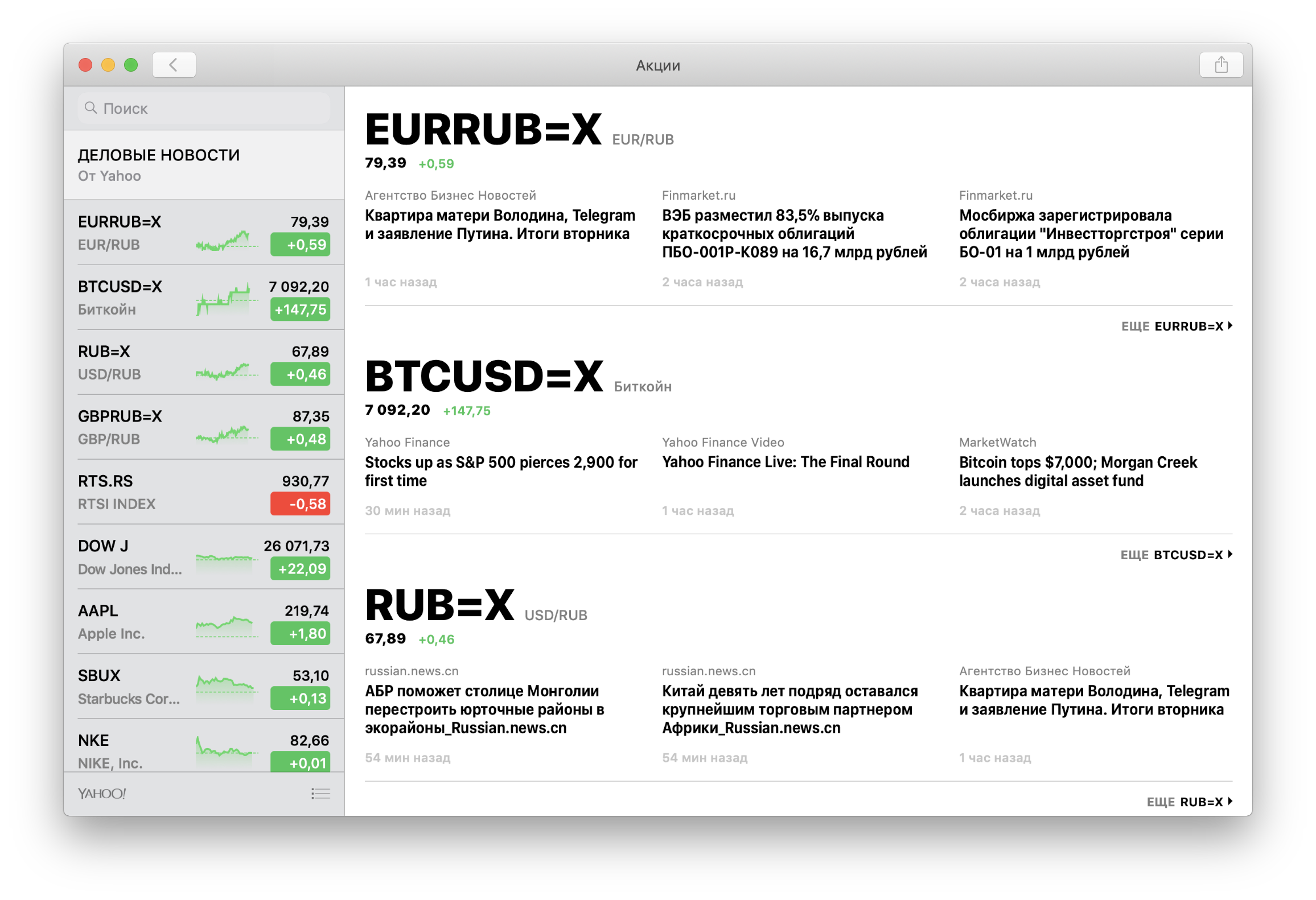 Также в приложении демонстрируется подборка новостей (с iOS 12 — и в мобильной версии тоже). Насколько можно понять, эти новости рекомендованы Yahoo! Finance, но выбор источников — довольно странный. И мы не нашли, как можно его изменить — ни в десктопной, ни в мобильной версии. Кроме того, в случае с macOS у нас есть сомнения в необходимости в появлении отдельного приложения «Акции»: ранее уже был доступен соответствующий виджет в панели «Сегодня», остался он и по сей день. И большого смысла переходить на полноценное приложение мы не видим, поскольку виджет, вызываемый одним кликом, вполне функциональный и наглядный. К счастью, он сохранился, так что им можно пользоваться и дальше.