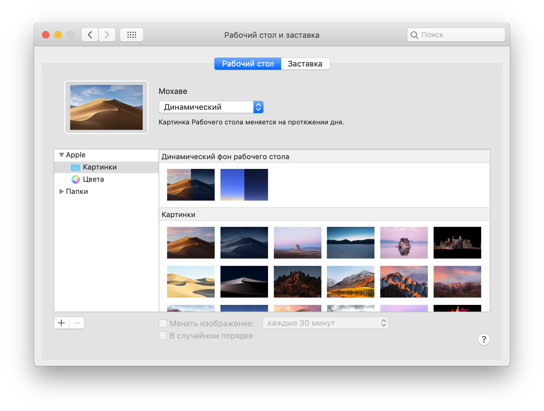 К ним же относятся и «динамические фоны». Это заставка рабочего стола, которая в течение дня меняет освещенность: с утра у вас пейзаж пустыни Мохаве освещен утренним светом, а вечером там темнота. И все эти изменения происходят автоматически, без участия пользователя.