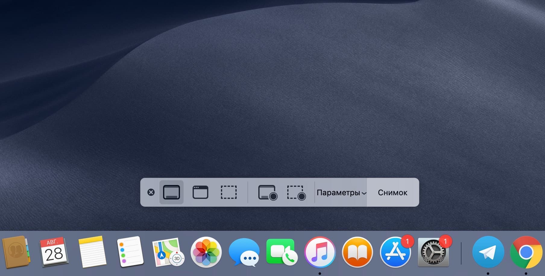 Еще одно новшество, может быть, не самое очевидное, но потенциально интересное многим, связано с расширенными возможностями создания скриншотов. В принципе, macOS и раньше была очень хороша для этого. Думаю, многие маководы уже вслепую знают комбинации клавиш Cmd+Shift+3 (снимок всего экрана) и Cmd+Shift+4 (снимок одного окна). Но теперь к ним добавилась комбинация Cmd+Shift+5. И она вызывает вот такое меню.