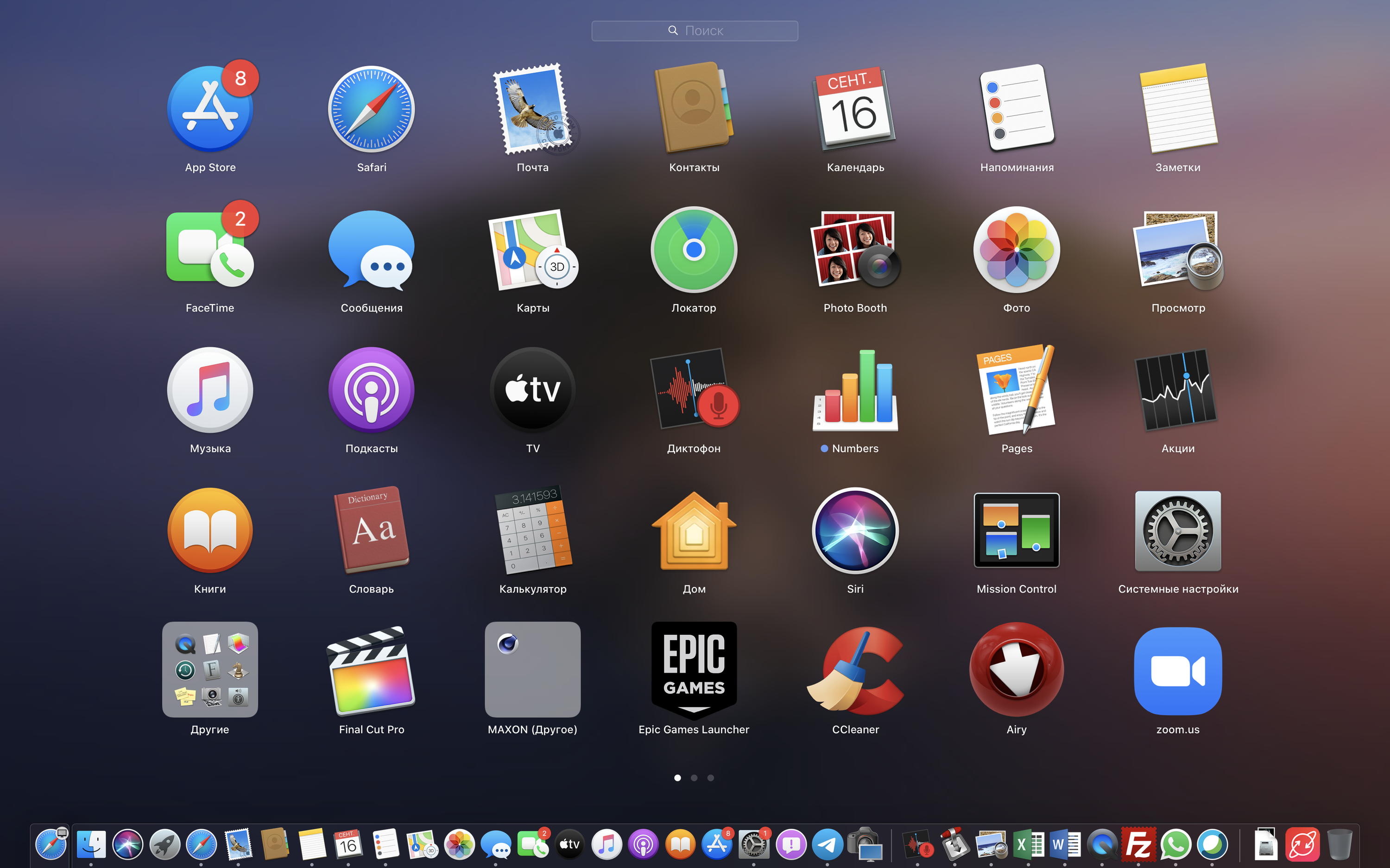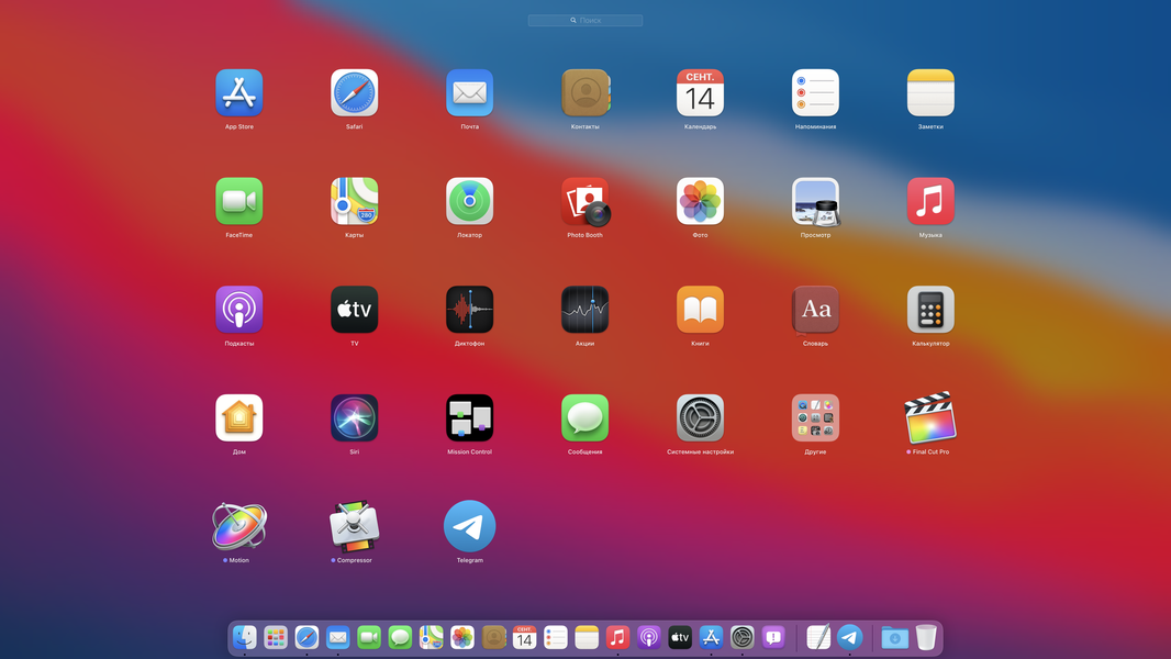 Для сравнения — Launchpad на macOS Catalina (не обращайте внимания на разные размеры иконок, дело не в операционной системе, а в разрешении экрана устройств). Видно, например, что Почта стала в точности как на iOS — никаких больше птиц. То же касается и других иконок — они стали почти идентичны мобильной операционной системе.