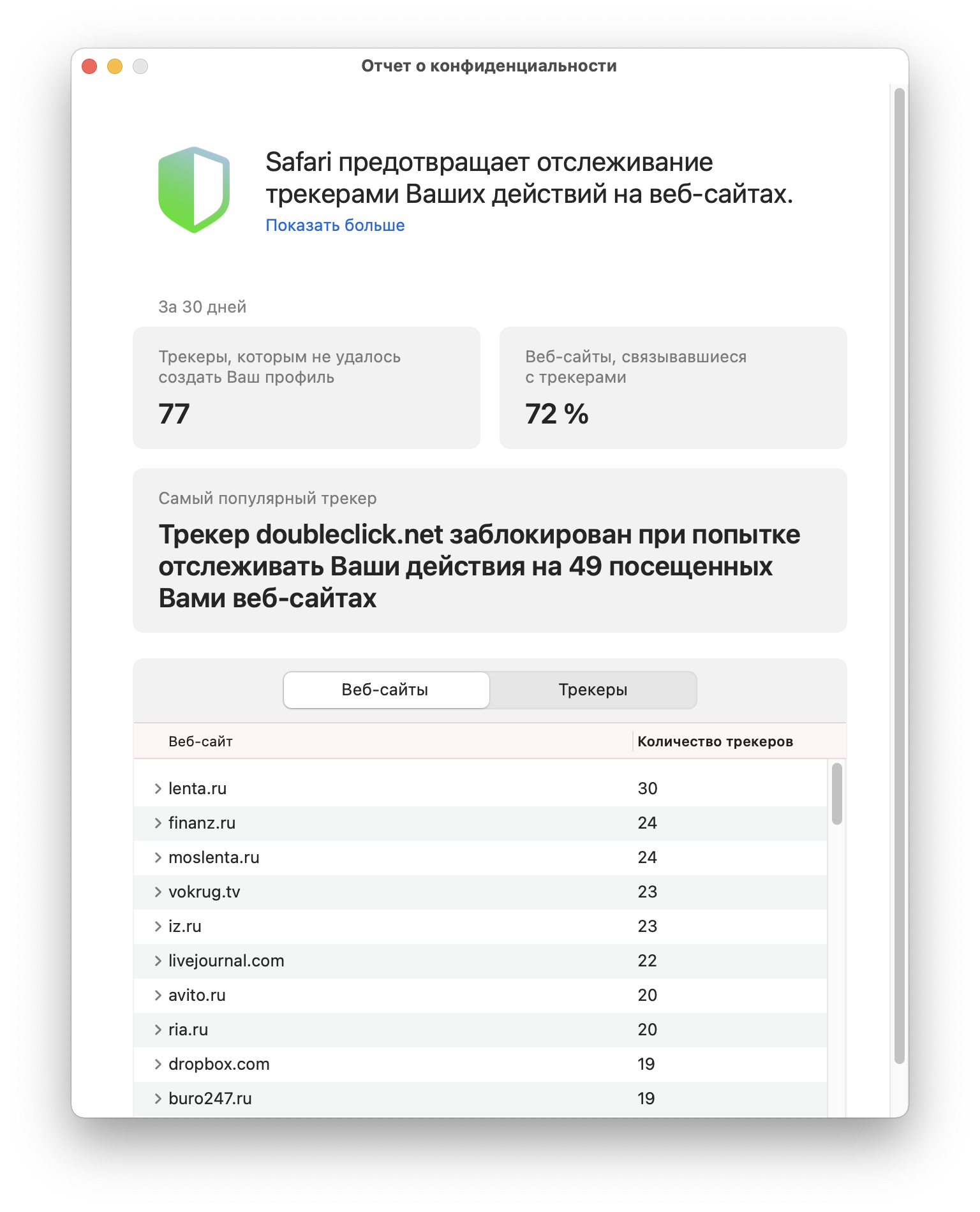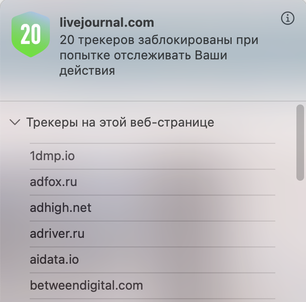 Если на нее нажмем, увидим, сколько трекеров на данном сайте заблокировано. В среднем это от 10 до 20.