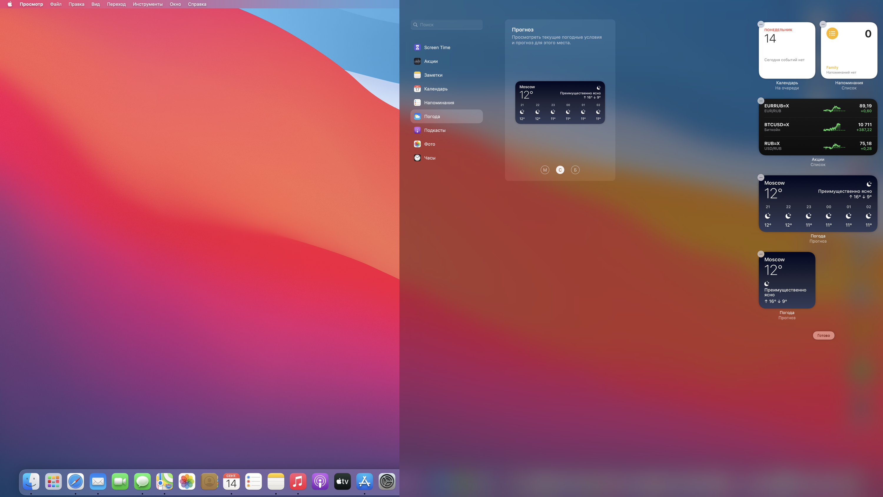 В галерее доступных виджетов под многими есть значок, обозначающий размер — целый, половина и четверть. На скриншоте выше видно, что погода и акции — половинки, а календарь и заметки — четвертушки. И вот как выглядят два виджета одной и той же программы, но разного размера.